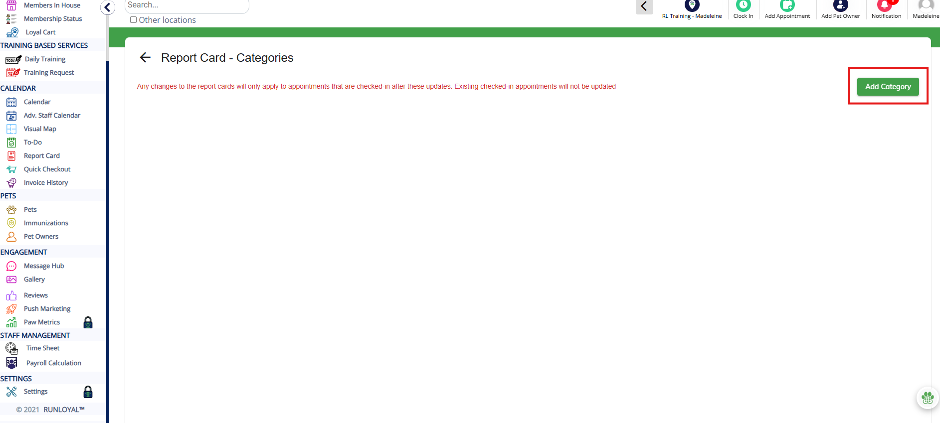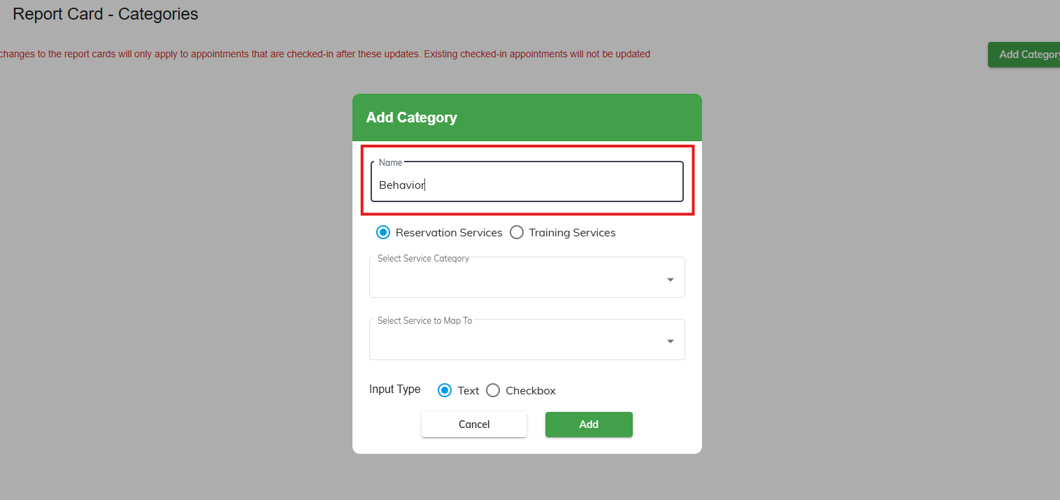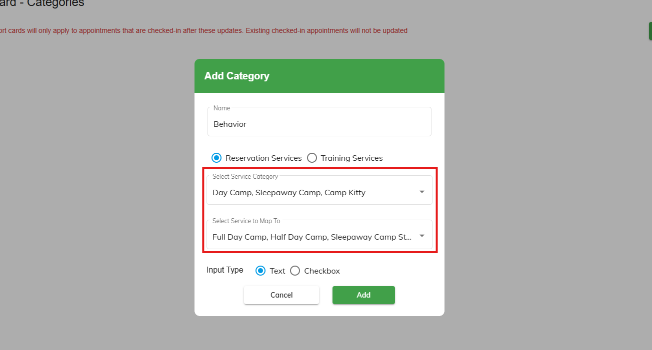 4. Select which service categories and services that should display this category. For example, you may have different categories for Boarding services (such as Sleeping Notes) than for Daycare services (such as Playmates).