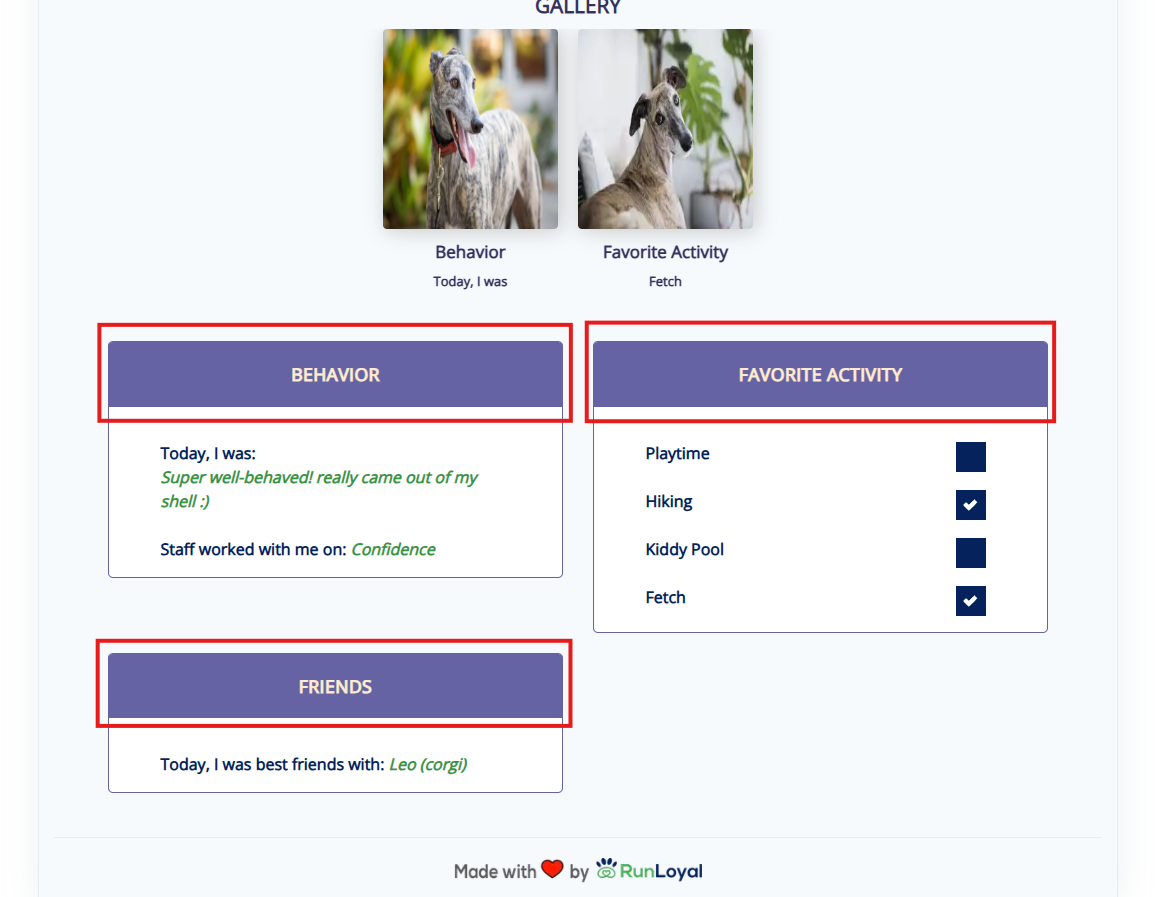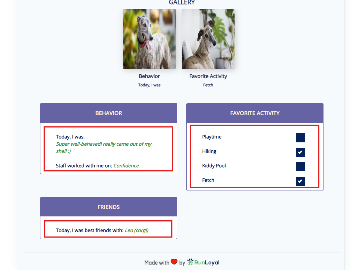 Report Cards allow pet owners to learn how their pet is doing while staying at your facility. Report cards are also an excellent way to share photos and updates throughout the pet's appointment. You can make report cards an included item or up-sell service. Many facilities use report cards to note a pet's daily activities, wellness, personality, energy level, favorite playmates, and more.