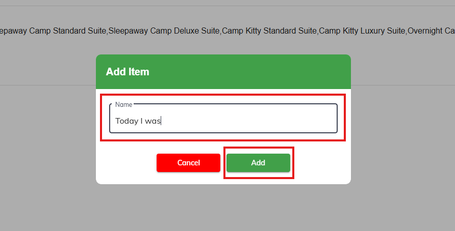 4. Enter the Item Name and click Add. Please note, the system will automatically add a colon and a space after each item when it displays to the customer so you do not need to add this as part of the question (such as ": ").