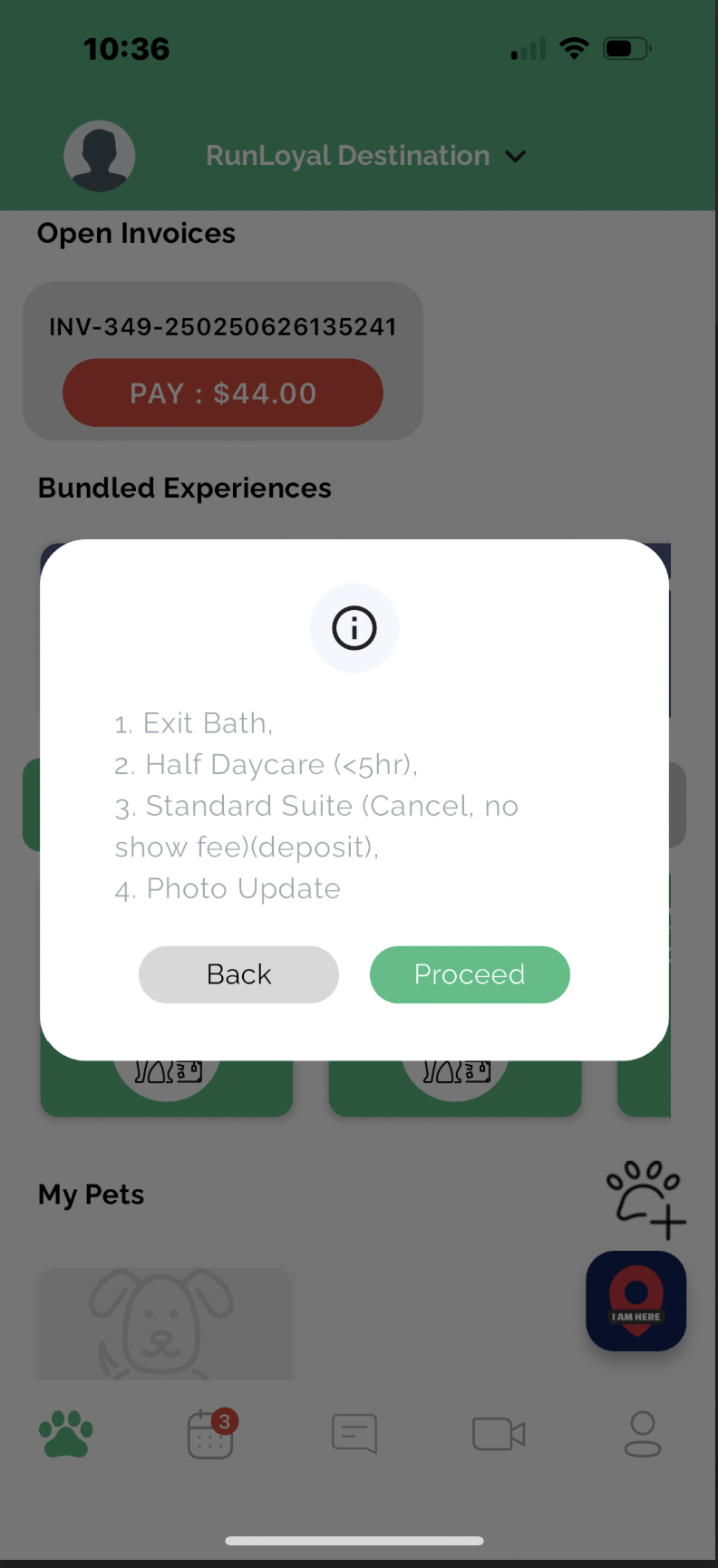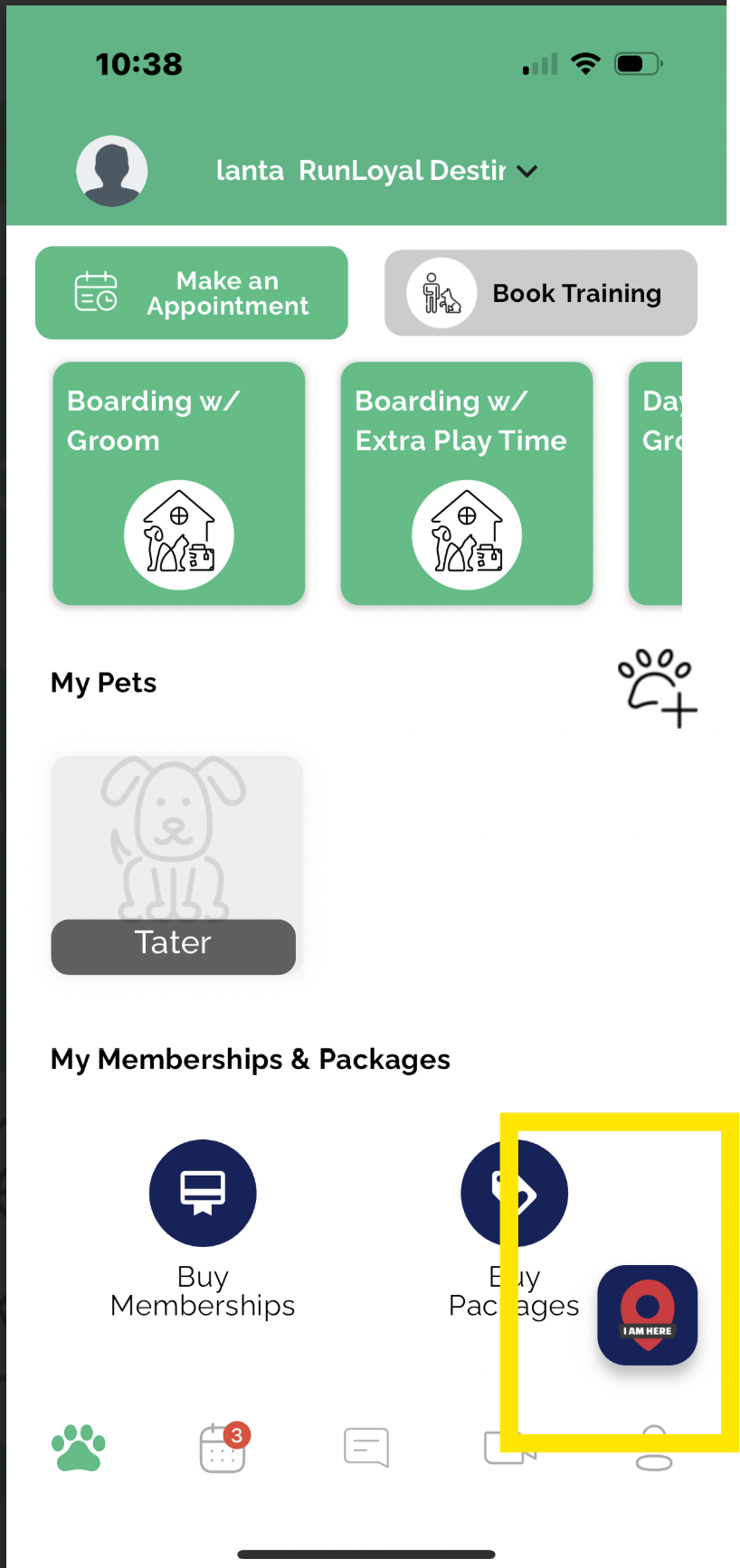 I'm Here - You can let the facility that you are booking with know that you are on your way to pick up your pet. If you allowed location services to the app it will give the facility an estimated arrival. Select the "I am here" button at the bottom right of the app and fill in if you are picking up or dropping off, your parking spot number, and the color of your car.