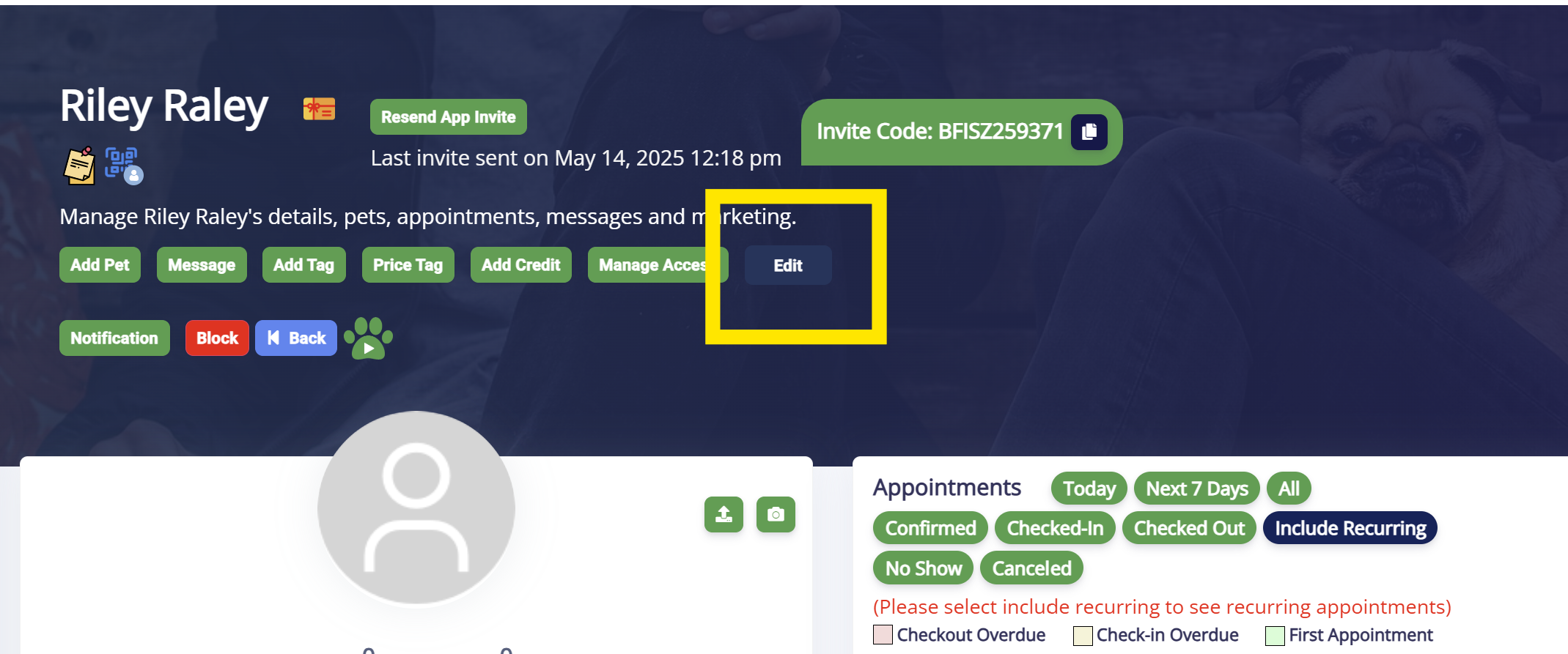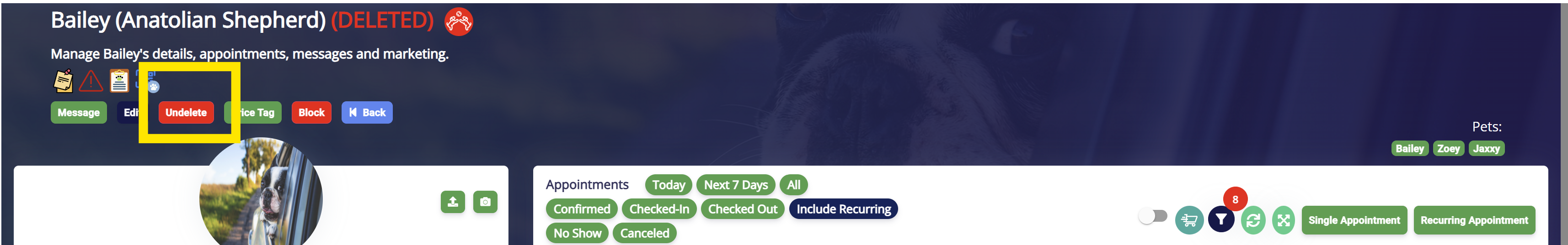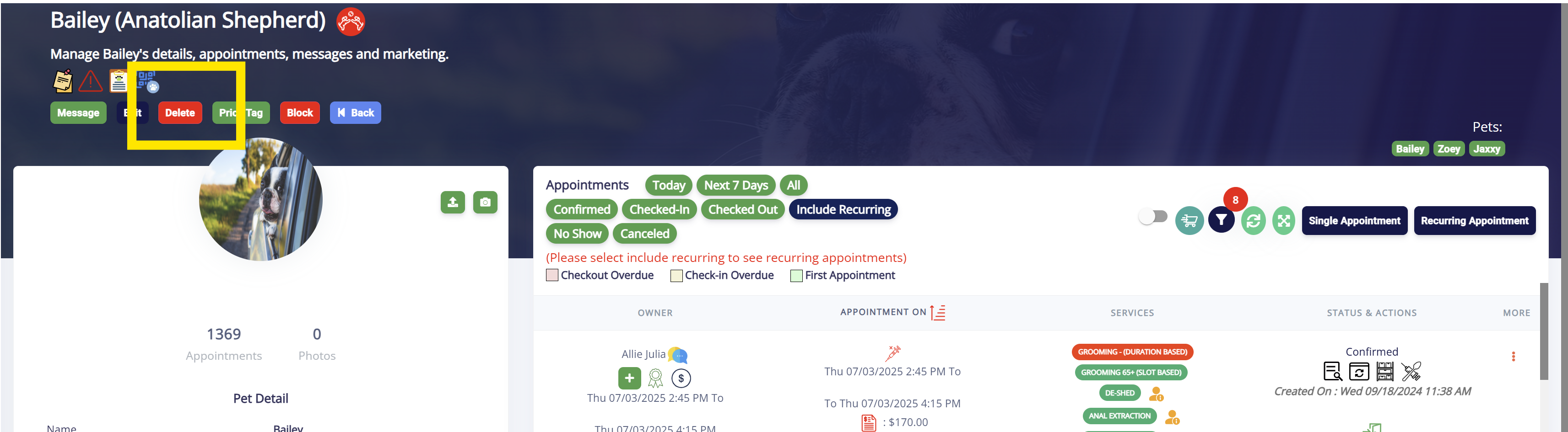 At the bottom of the pop-up, there is a delete button. Once deleted, there is no way to reactivate this pet owner on your end please contact support at puppylove@runloyal.com for our team to reactivate a pet owner profile for you.
