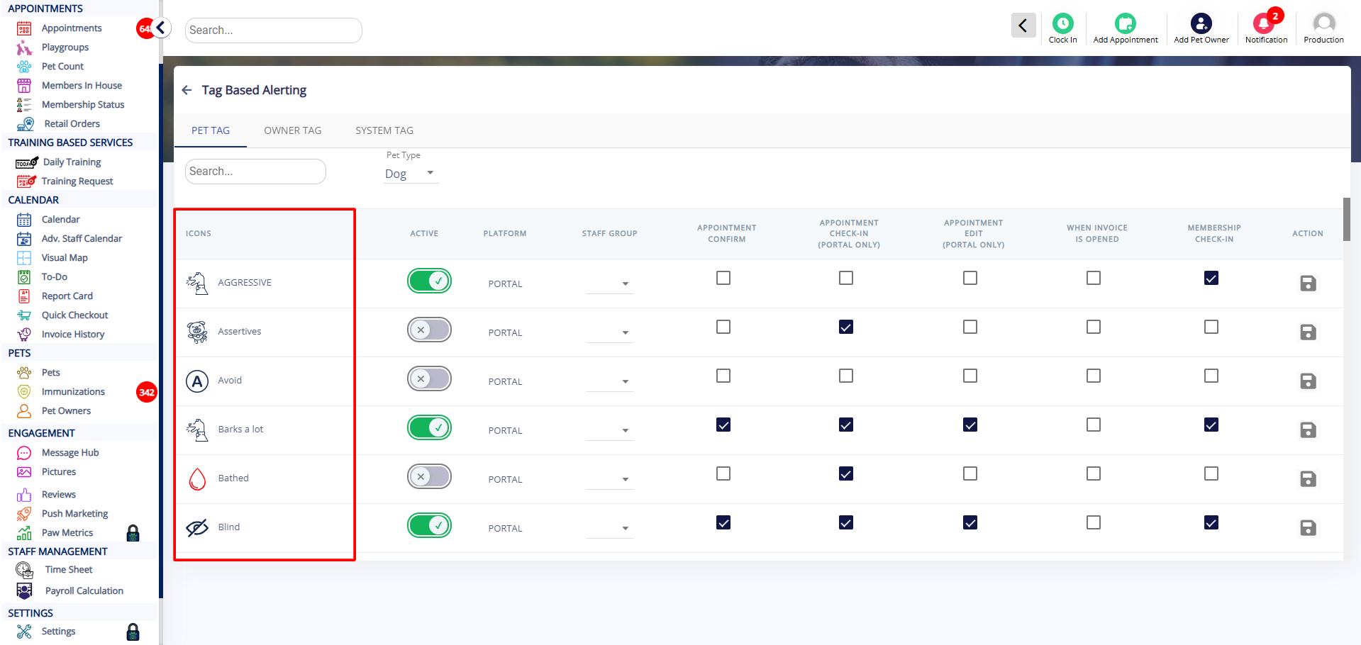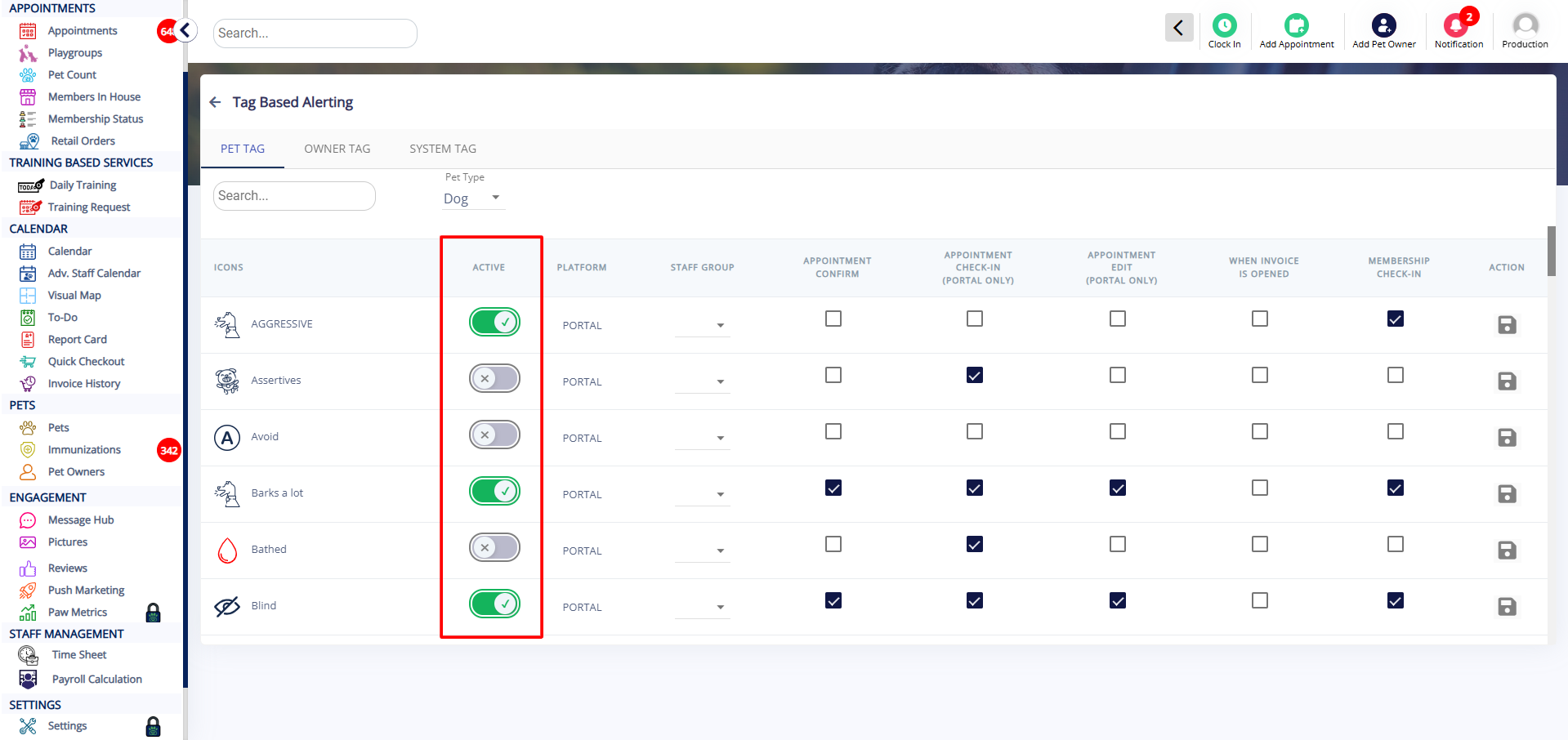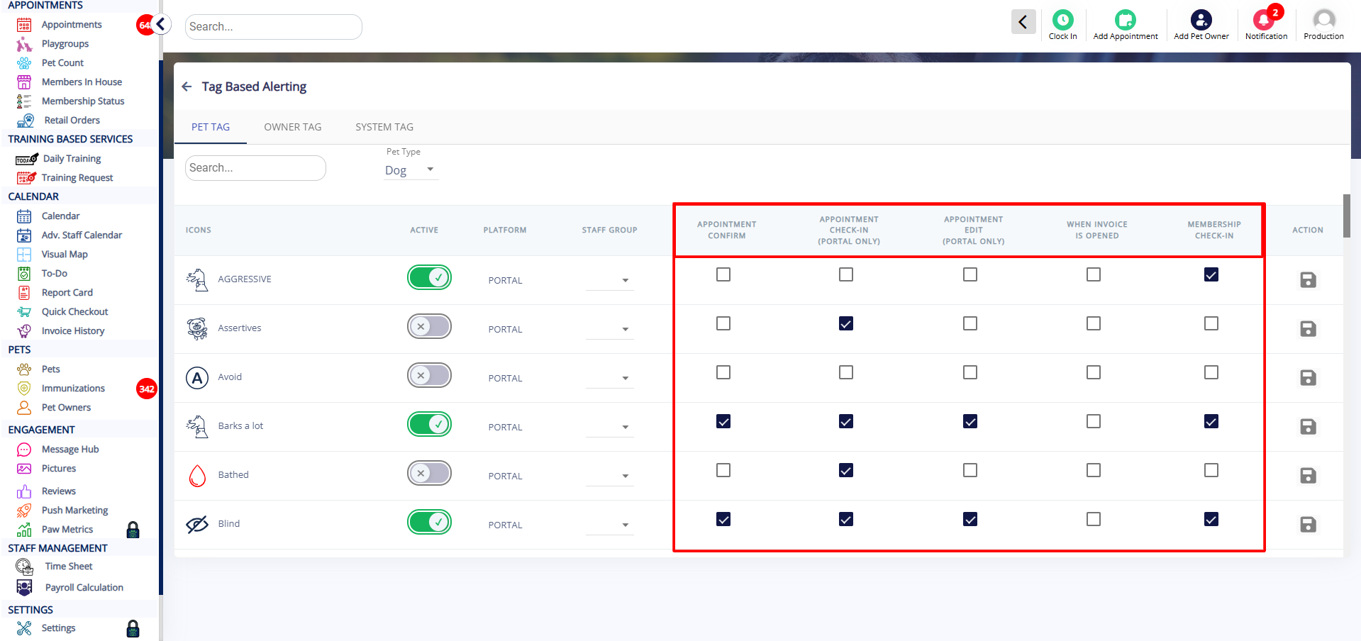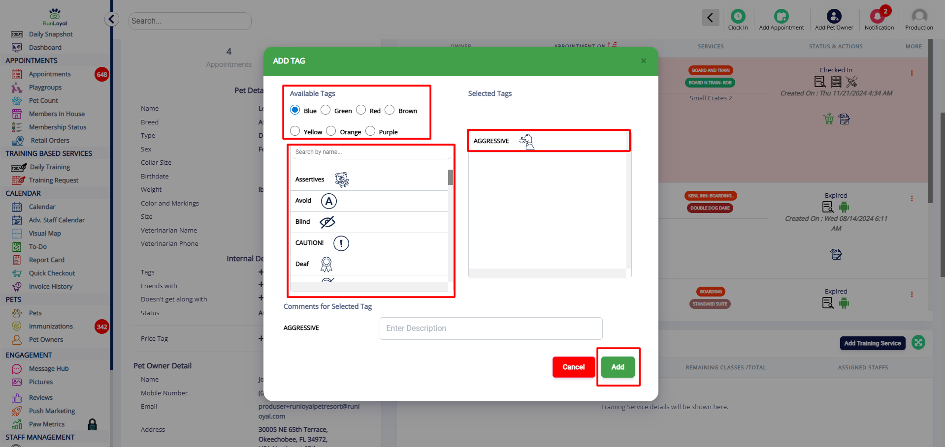 Tag-based alerts help you quickly identify important information about a pet or a pet owner whenever their profile or appointment is accessed. Both pet and pet owner tags are internal to your operation and not visible to your pet parents.