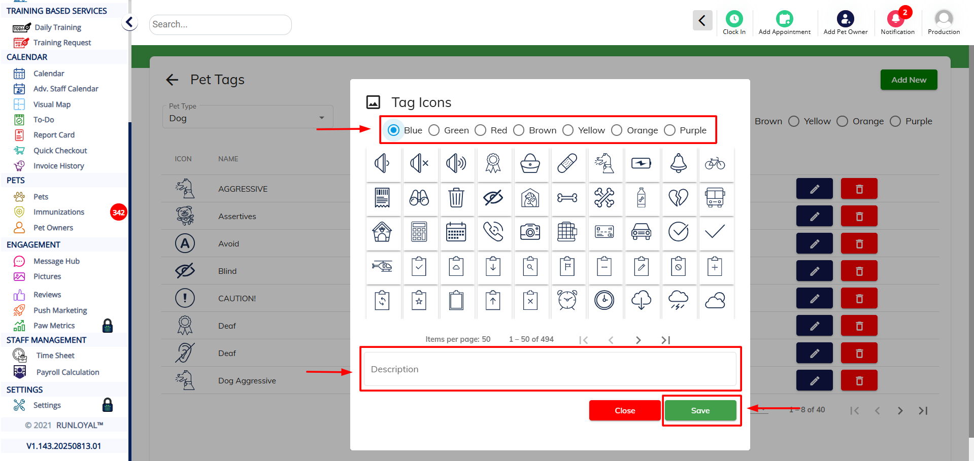 You can now assign the created tag to a pet by opening their profile and clicking the “Add” icon next to Tags. You can do the same by visiting pet owner profile and tags for them.