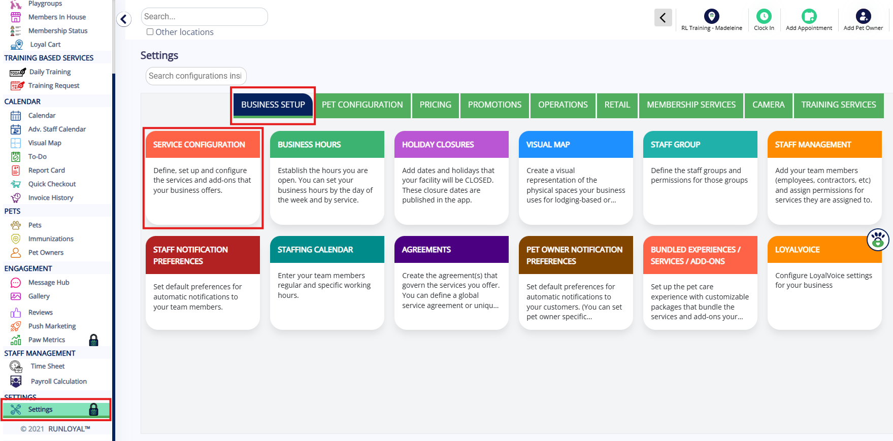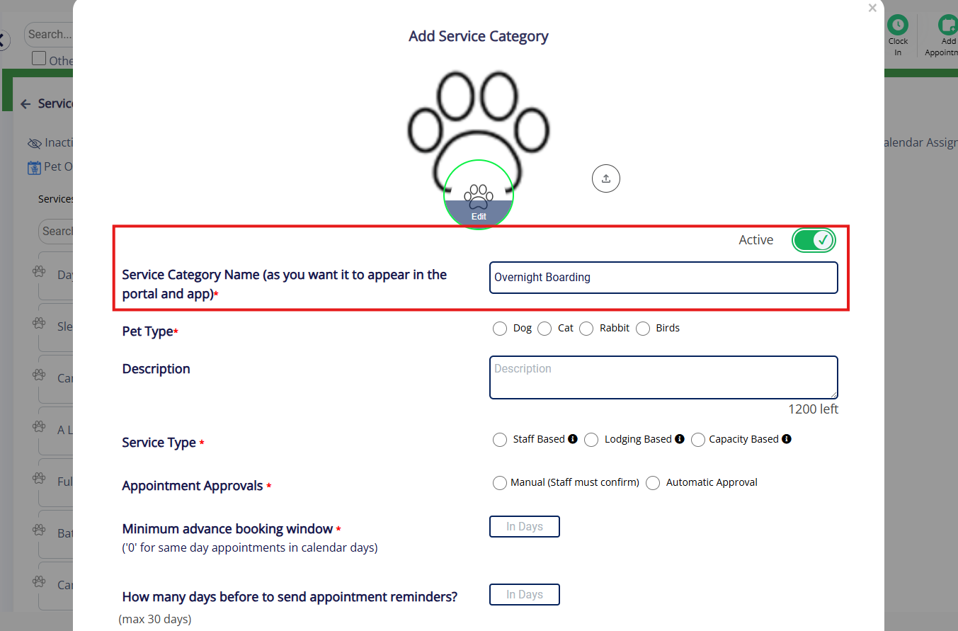 Service categories are the overall header of potentially multiple services you offer at your business. For example, you may have a Service Category titled Overnight Boarding that includes the Services titled Overnight Boarding Standard Suite and Overnight Boarding Luxury Suite. This article will assist in setting up the overall Service Category Overnight Boarding. If you would like to add Boarding Services, please navigate to the article: Create Lodging-Based Services (Boarding).