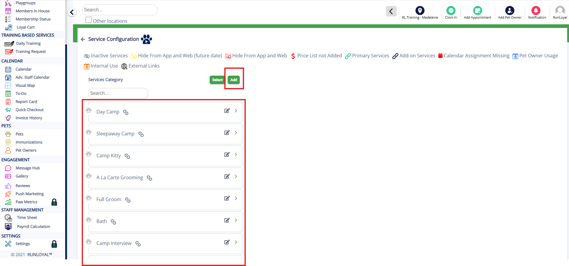 2. If you are creating a brand new category such as Boarding, click Add next to Service Category