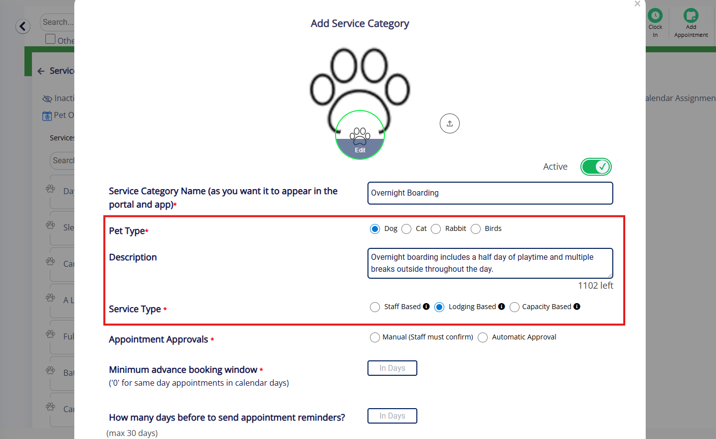 4. Choose the Pet Type (such as dog) and optionally enter a brief description that will be visible to staff and customers when creating the booking. For Service Type, select Lodging Based.