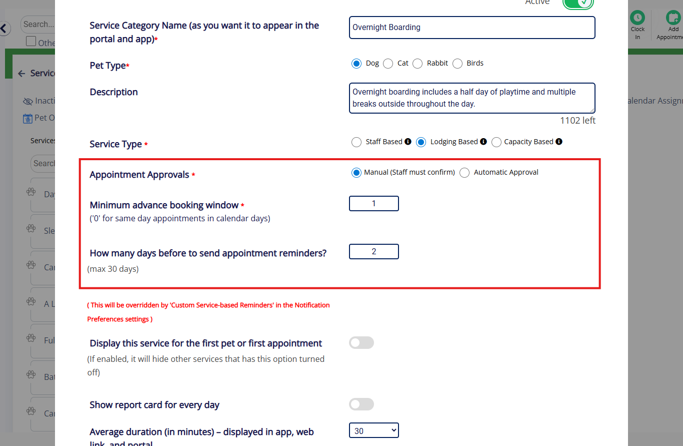 5. Choose Appointment Approvals to be either Manual (the pet owner submits the request and your staff approves it) or Automatic (all requests submitted by the pet owner are automatically approved). Set Minimum Advance Booking Window to the minimum number of days a customer must request in advance of their drop-off date (such as 1). For How many days before to send appointment reminders?, enter the number of days in advance appointment reminders should send (such as 2).