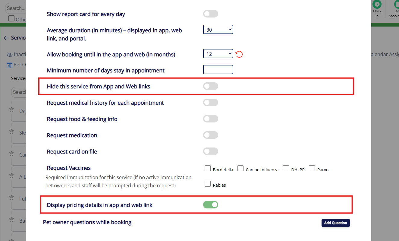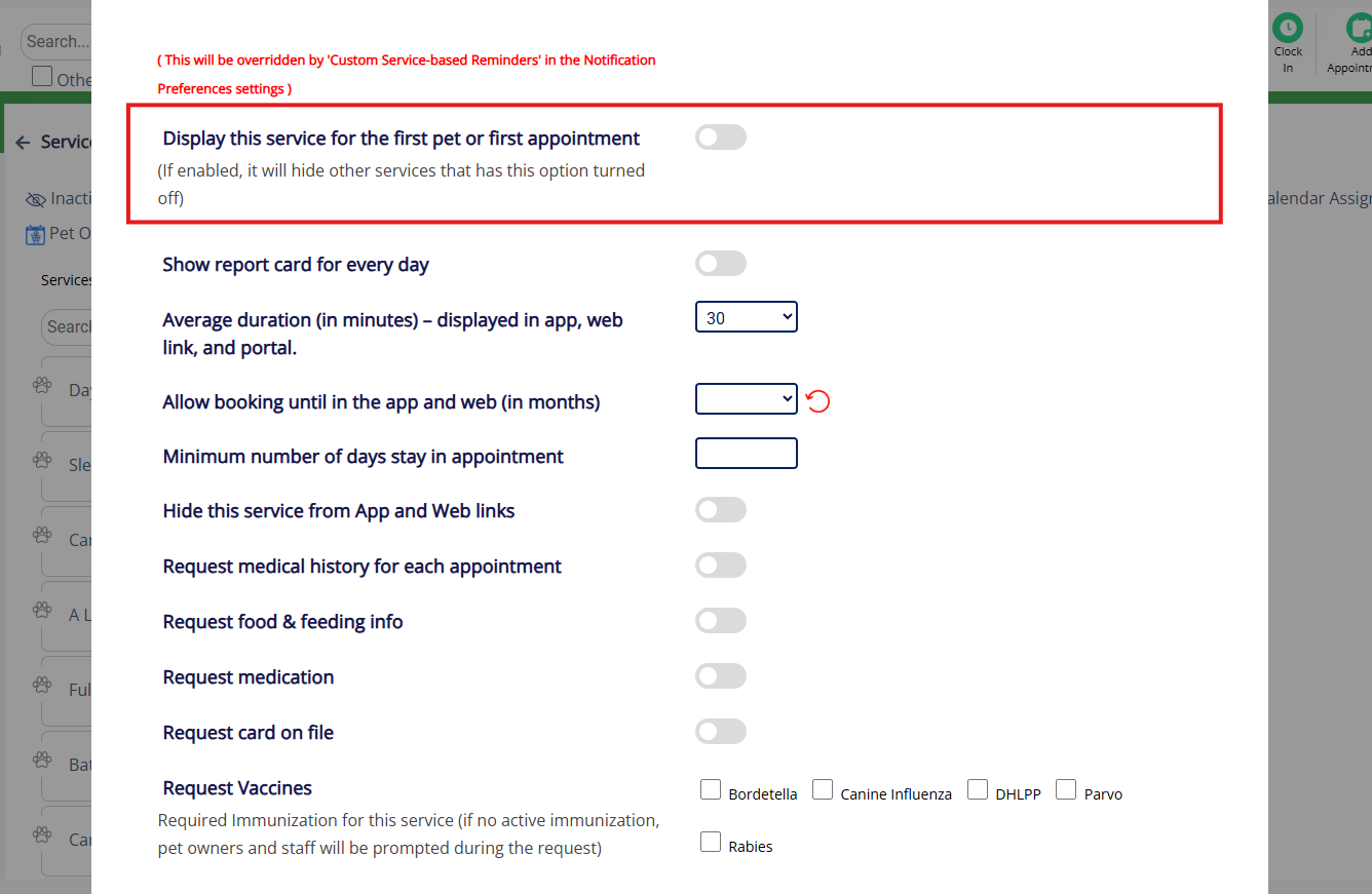 6. For Display this service for the first pet or first appointment?, only toggle this setting on if customers must book this service before they can book anything else at your facility. For Boarding, this is most commonly disabled.
