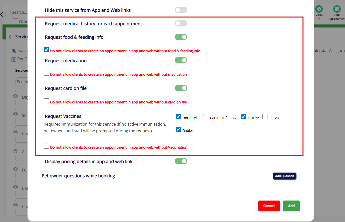 11. If the customer should be prompted to enter pet medical history, toggle on Request medical history for each appointment. If the customer should be prompted to enter pet feeding information, toggle on Request food and feeding info. If the customer should be prompted to enter pet medication, toggle on Request medication. If the customer should be prompted to enter a card on file, toggle on Request card on file. If the customer should be prompted to submit pet vaccine data, check the box next to each required vaccine next to Request Vaccines. For all of these options, the customer can optionally enter the data. Once the toggles are enabled, you can check the required box make some of these fields mandatory. If you check this box, the customer will be unable to submit the appointment request until data is entered in the required field(s).