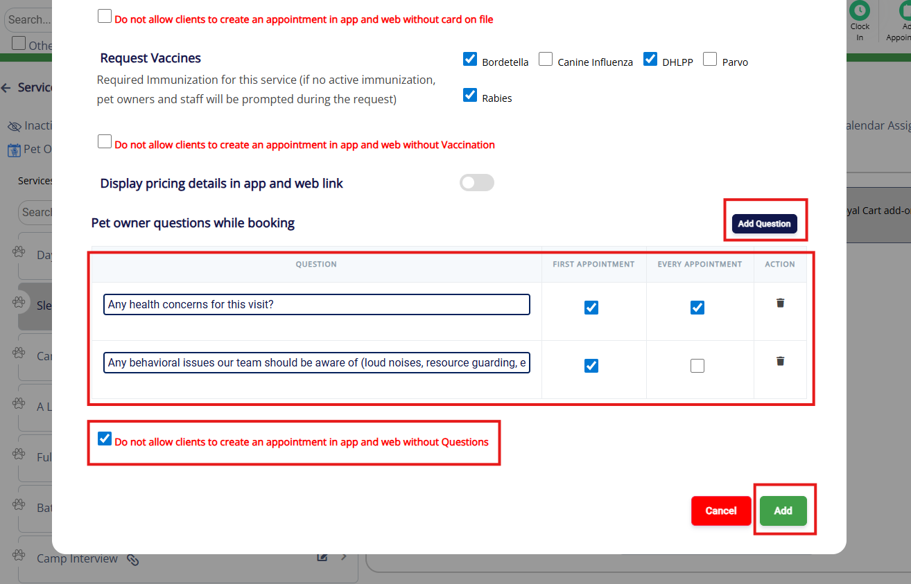 12. You can optionally add any questions unique to this booking category by clicking Add Question. Then enter your question and set whether it should be prompted at the first appointment or all appointments. Check the required box to make all questions mandatory. Once all settings are correct, click Add to save the service category.