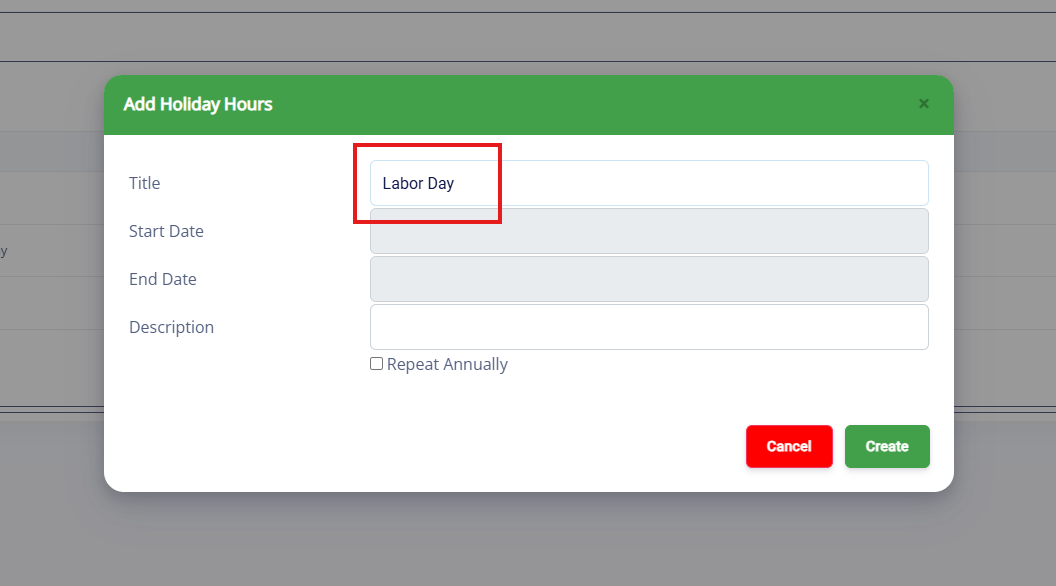 3. Type in the holiday closure title that customers will see (for example, Labor Day).
