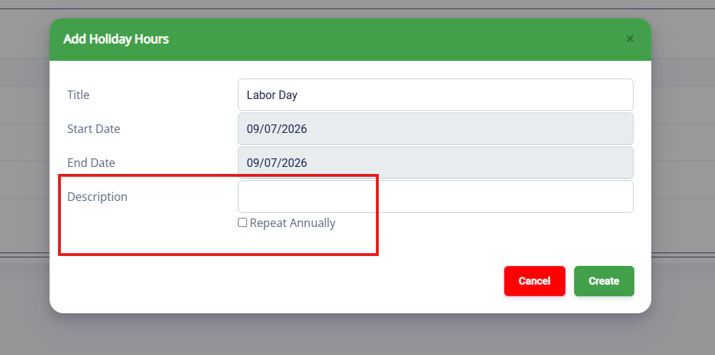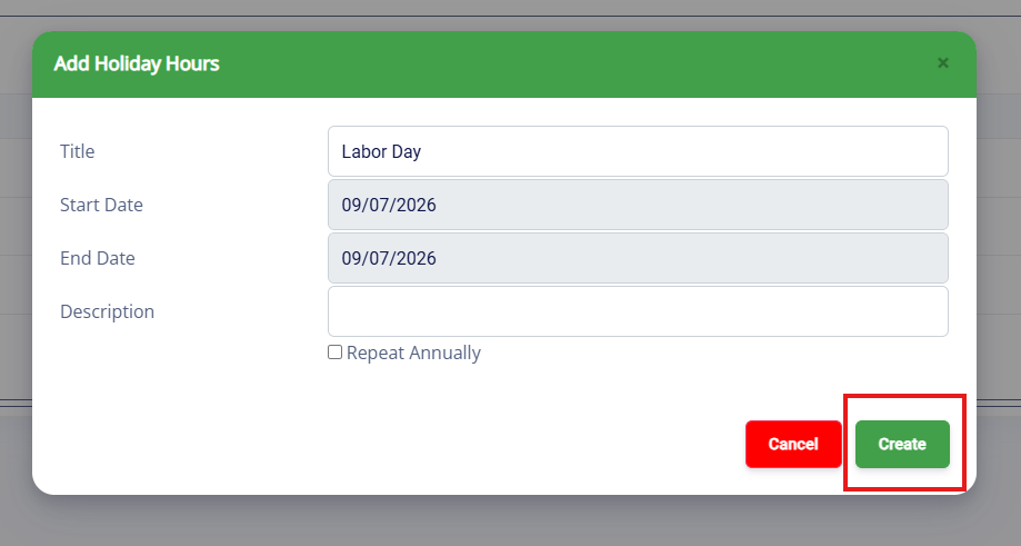 6. (Optional) If the holiday occurs on the same date each year, check Repeat Annually. For holidays that change yearly (like Labor Day), it’s better to create a new date each year.