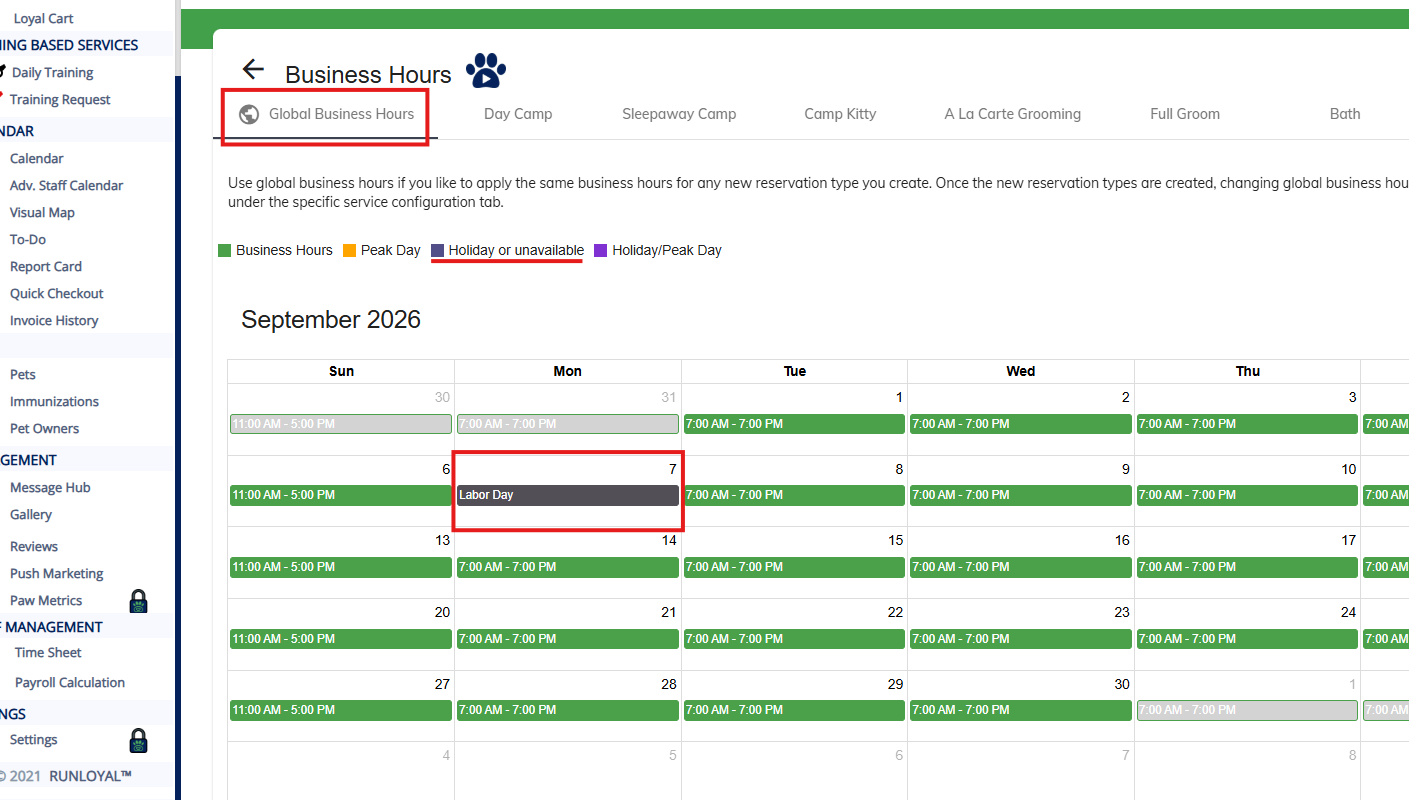 For more information on Peak Days and Peak Day Fees, please refer to this article: Allowing Peak Day Fees for Holiday Closures in RunLoyal