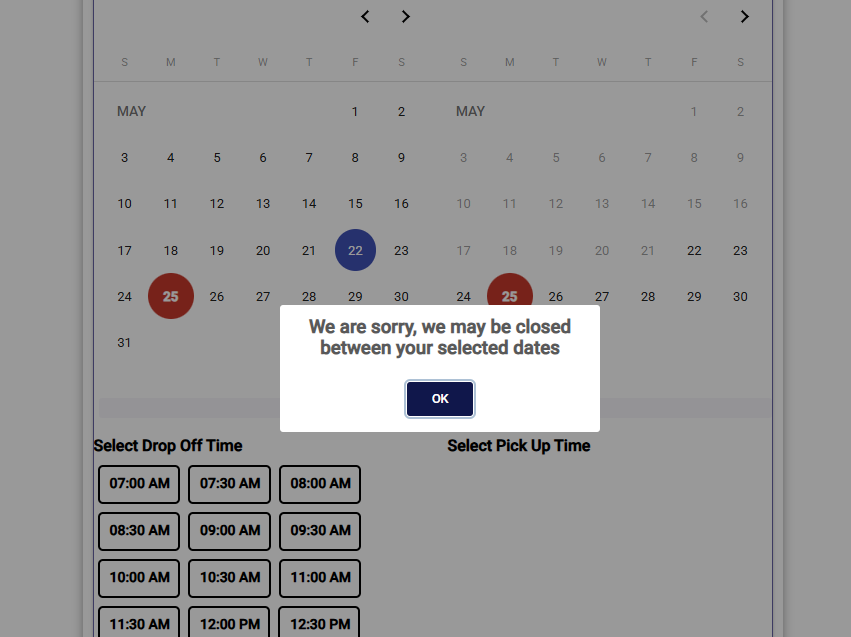 Holidays allow you to mark specific days when your business is closed. This will prevent drop-offs and pickups on that specific date. Depending on your settings, you can optionally allow or prevent appointments that cross over holiday dates as long as the start or end date does not fall on the specific holiday.
