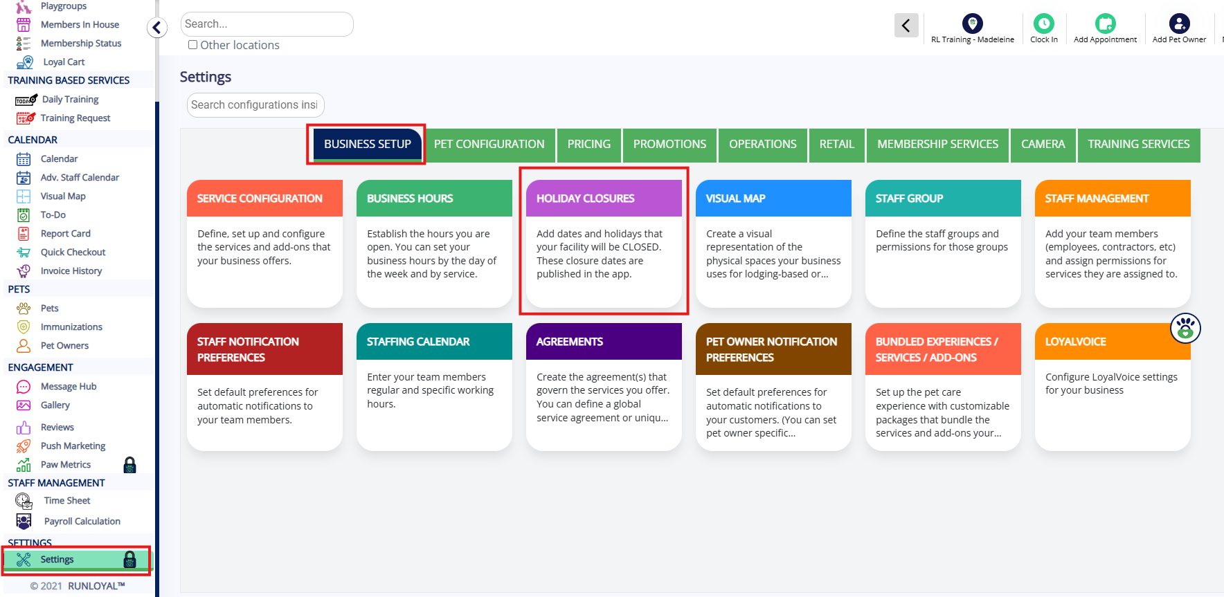 1. Navigate to Settings > Business Setup > Holiday Closures.