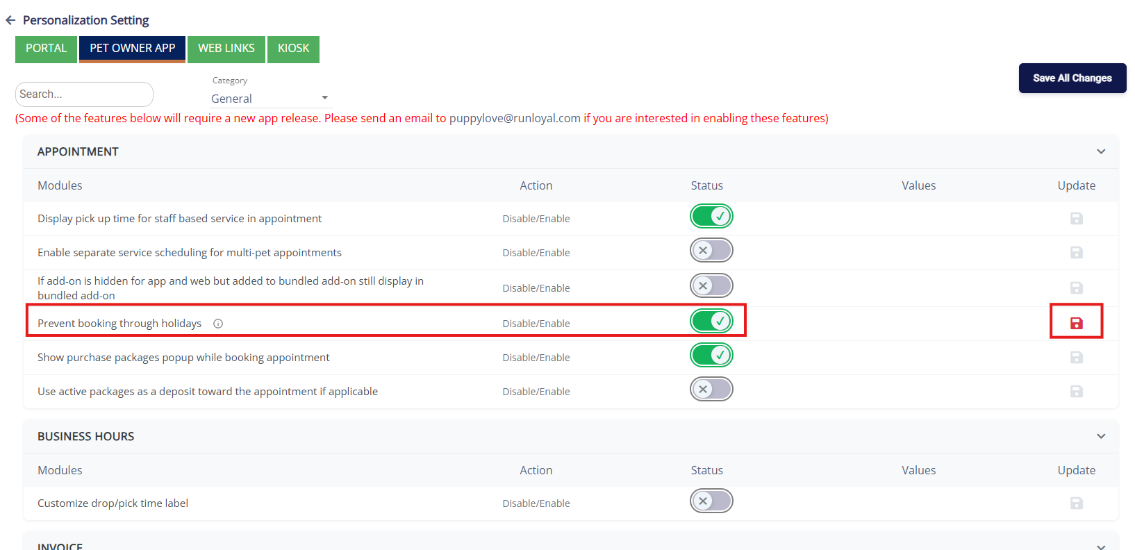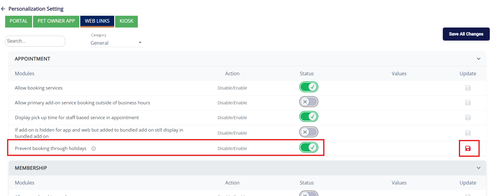 3. Enable the toggle: Prevent booking through holiday, and click Save.