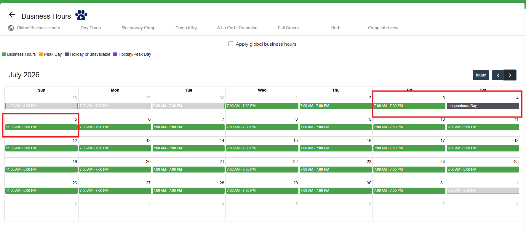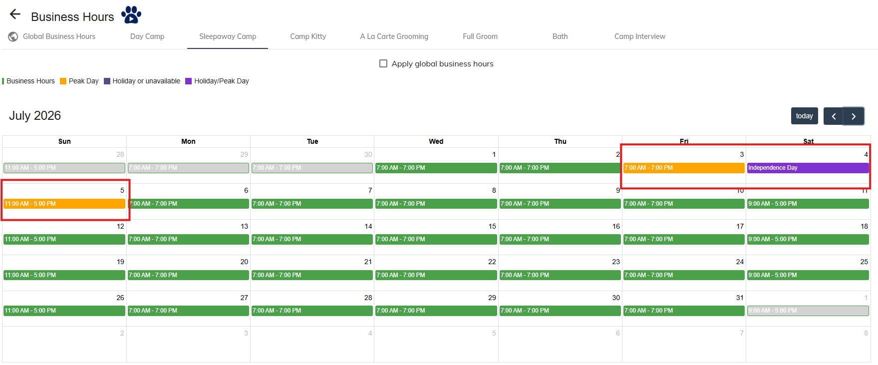 Peak Days allow you to mark specific days on your calendar, such as holidays or days surrounding the holidays, as "peak" times. If you have peak day pricing set up, this will apply an automated surcharge to customers on their invoice for the applicable services if they are in-house during peak days.