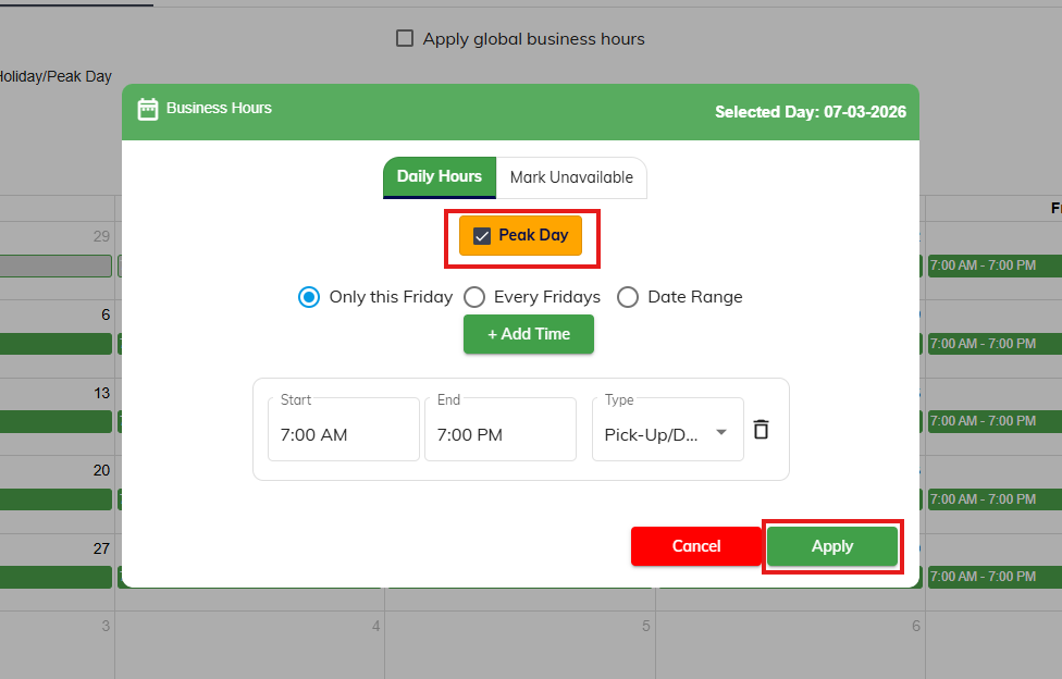 4. Check the Peak Day checkbox to mark the holiday as a peak day. If you are just selecting a singular peak date, then select Apply.