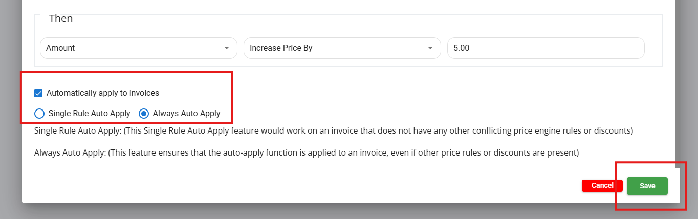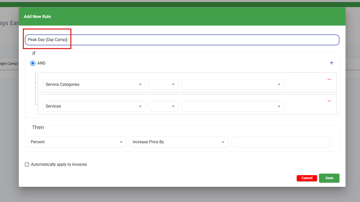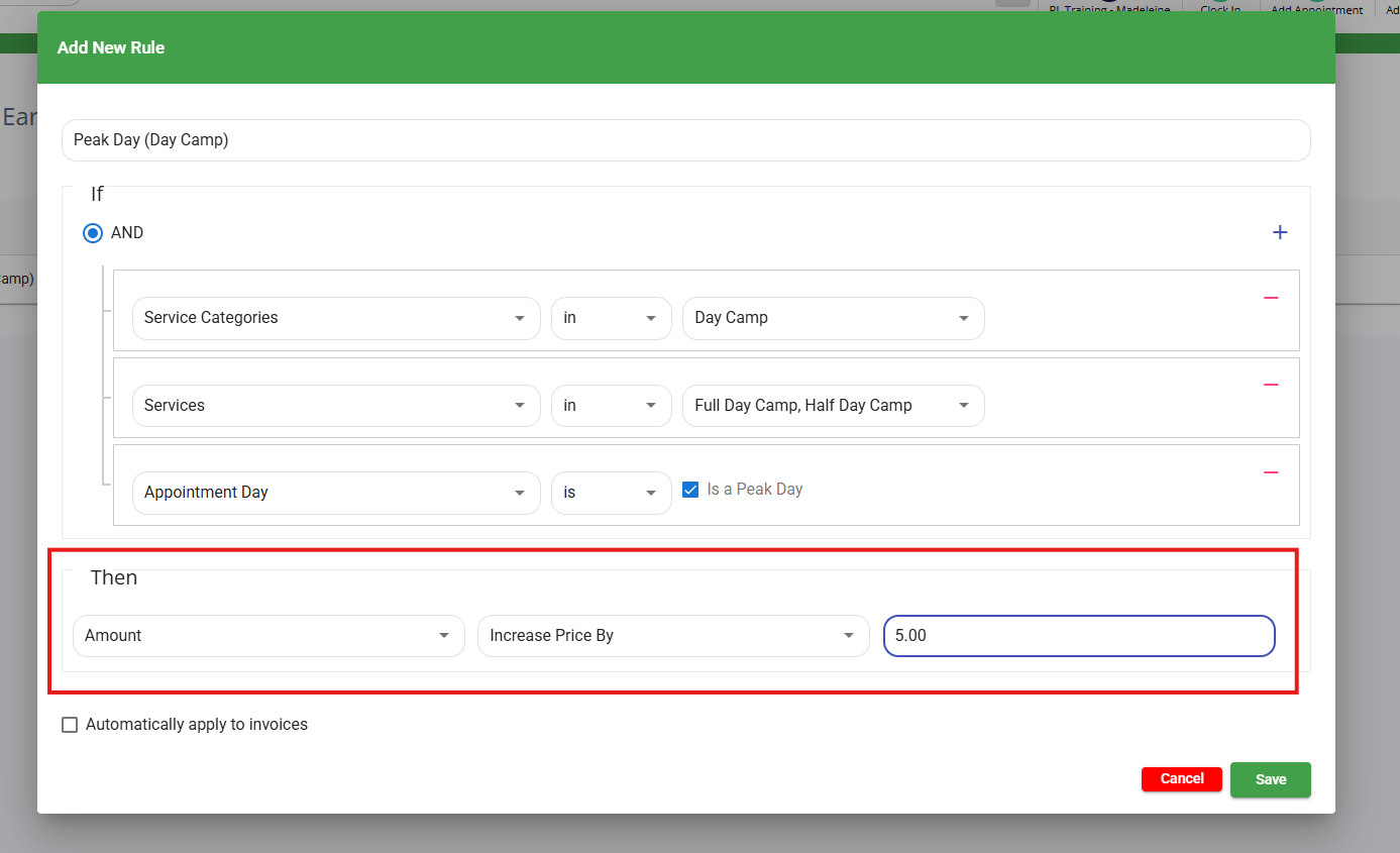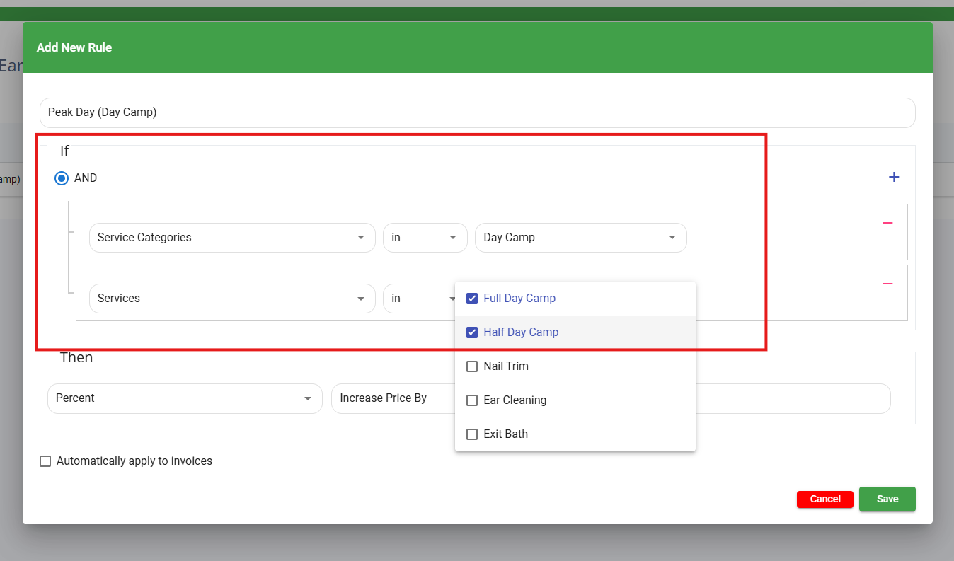 6. In the section starting with "Then", select either a percentage or flat amount that will adjust the service price, as well as Increase Price By or Decrease Price By. Then enter the amount.