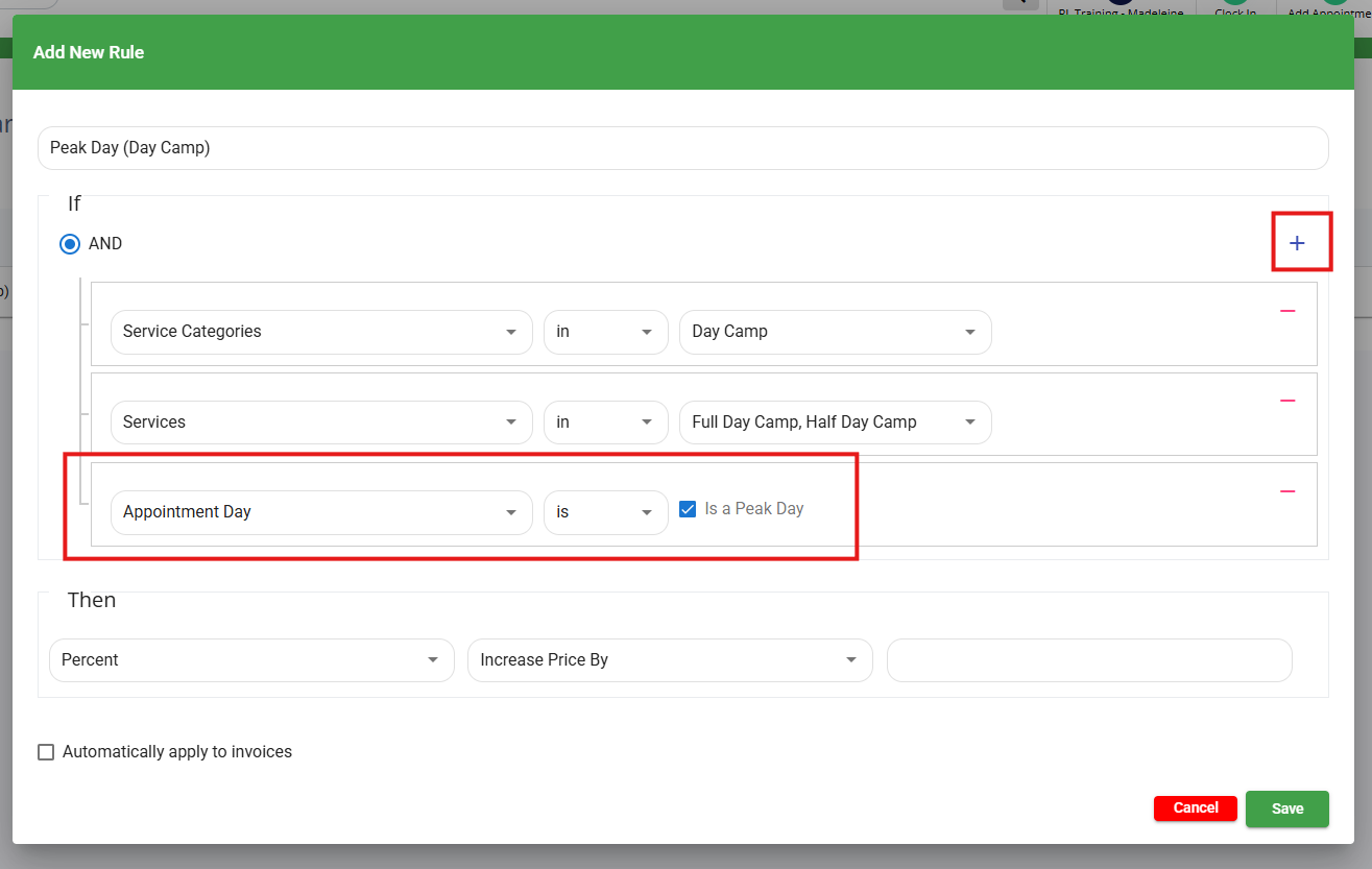 5. Click the "+" icon and for the final rule, select Appointment Day. It should automatically populate with Is a Peak Day.