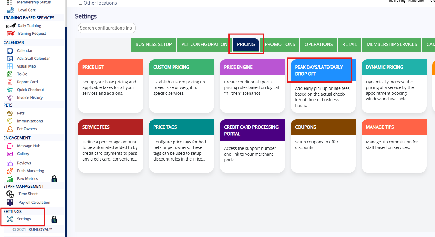 1. Navigate to Settings > Pricing > Peak Days / Late/Early Dropoff.