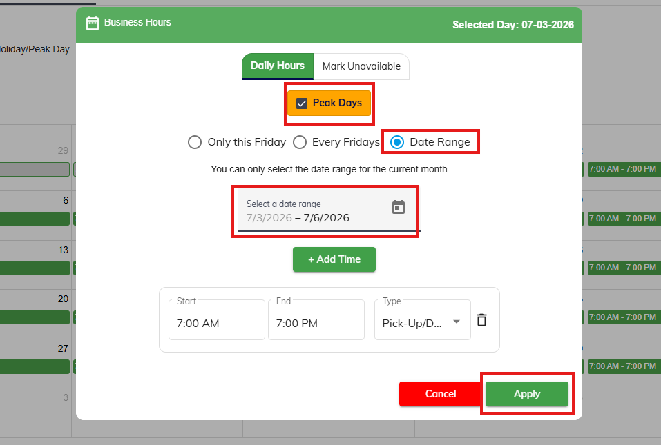 5. If you are setting a peak day range, check the Peak Day checkbox and then select Date Range. Select the range for your peak days. Then select Apply.