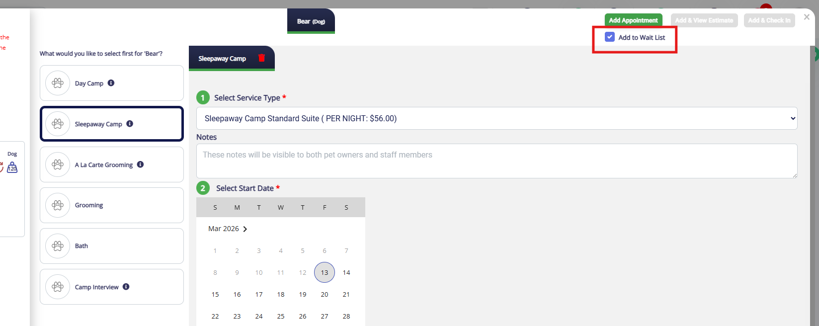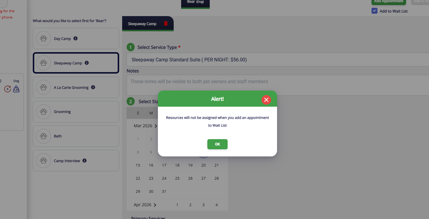 The Waitlist feature allows you to add pets to a queue for a specific service if existing appointments are full or if a client would like an earlier opening. If a slot becomes available due to a cancellation or schedule change, staff can review the waitlist and fill the opening with a pet that is already waiting. Using the waitlist feature helps maximize schedule utilization and ensures clients who want earlier availability can be accommodated when openings arise.
