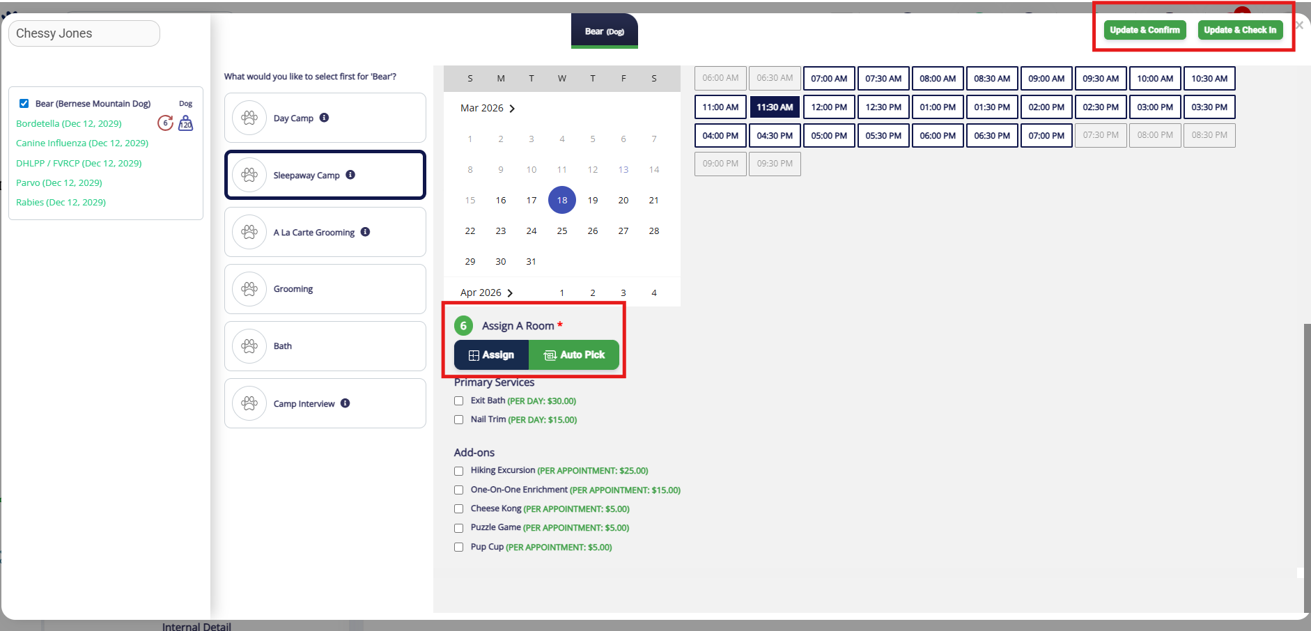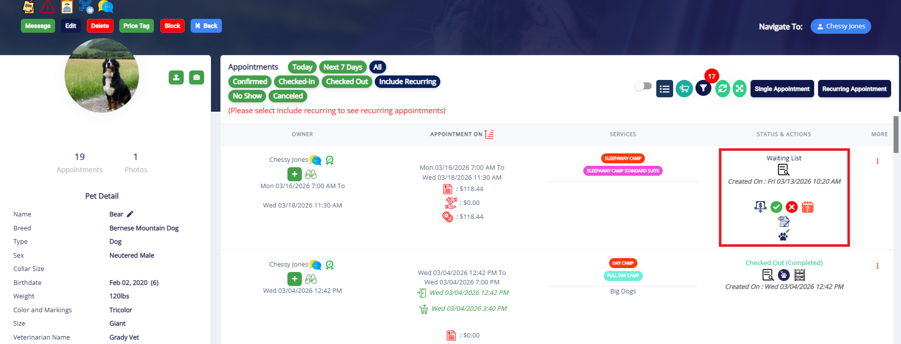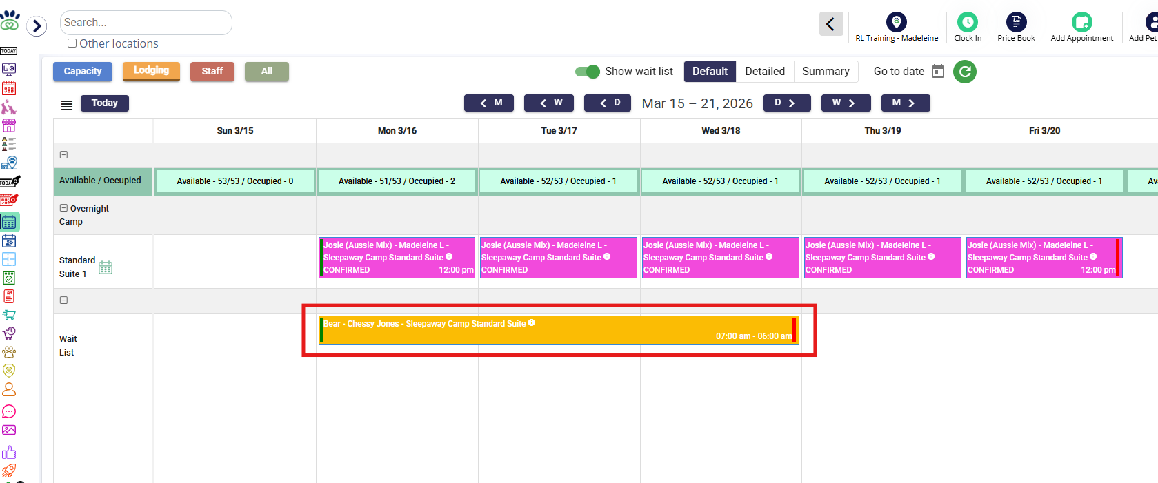 2. Waitlisted appointments appear at the bottom of the calendar. When ready, click on the pet owner’s name to open the confirmation screen.