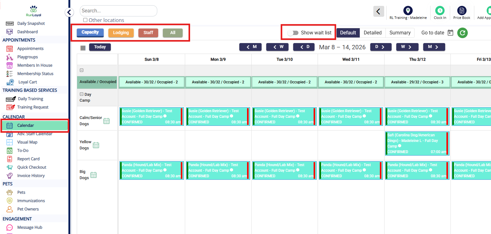 1. To view waitlisted appointments, go to the Left-hand navigation > Calendar tab. Select the appropriate type of service category (Capacity, Lodging, or Staff) and toggle Show Wait List at the top.