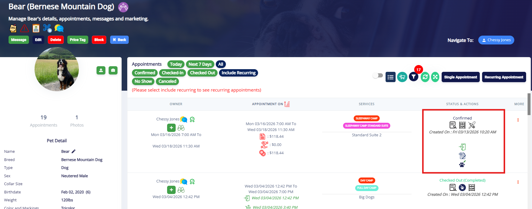 1. From any page in the app, click Top right-hand navigation > Add Appointment to create a new appointment for any pet.