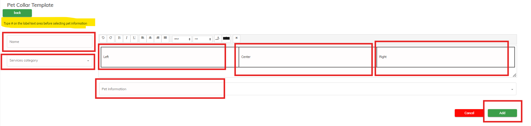 7. Fill in the pet information in the Left, Center, and Right boxes using “#” before selecting from the dropdown → Click Add to create the template