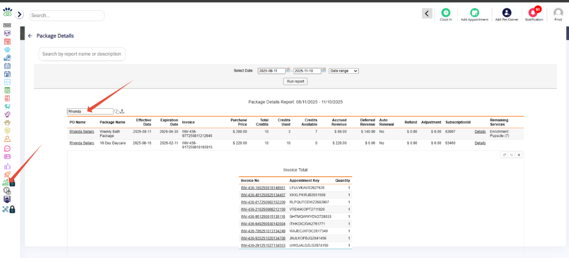On navigating to Package details, you can give the respective Pet Owner (PO's name) to obtain the exact report.