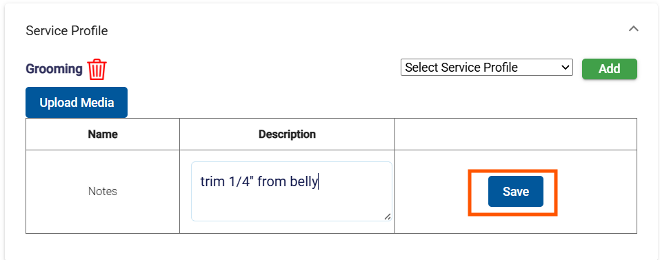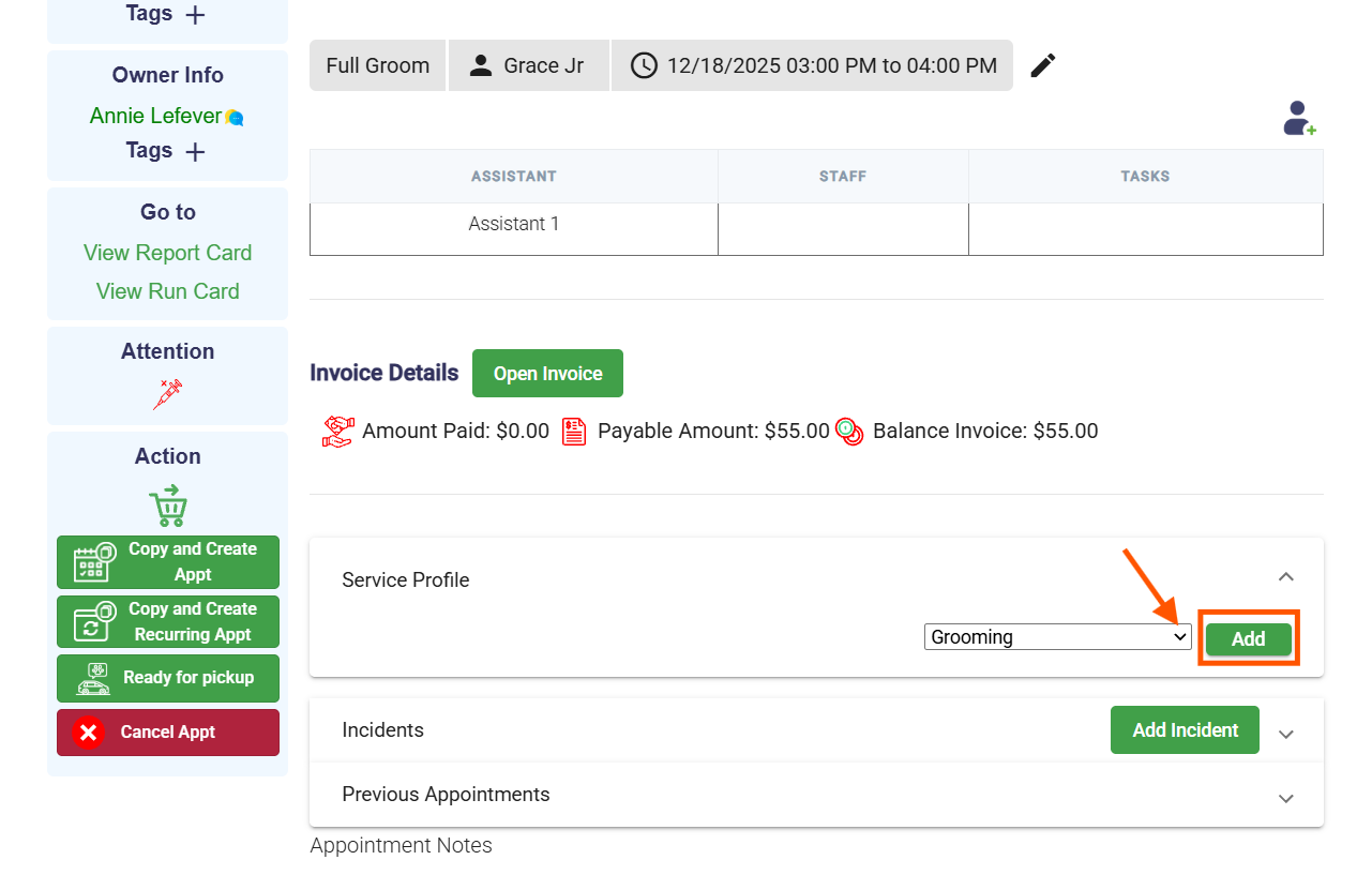 This section outlines how to assign a Service Profile to a pet directly from the Advanced Staff Calendar. Adding a Service Profile from an appointment allows staff to quickly document and access service-specific details tied to that scheduled visit.