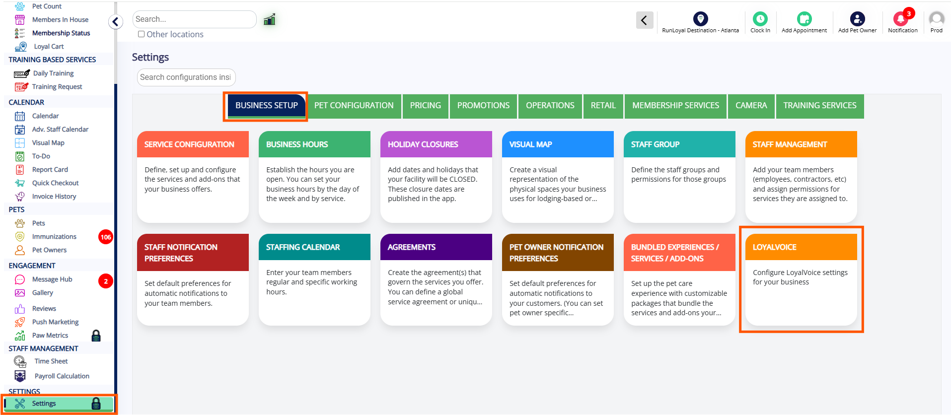 1.Navigate to Settings > Business Setup > LoyalVoice as shown below.