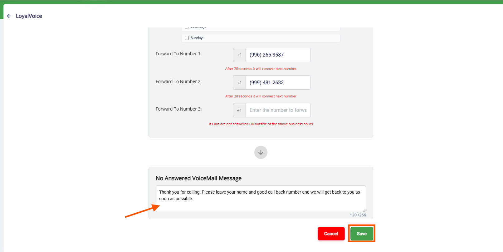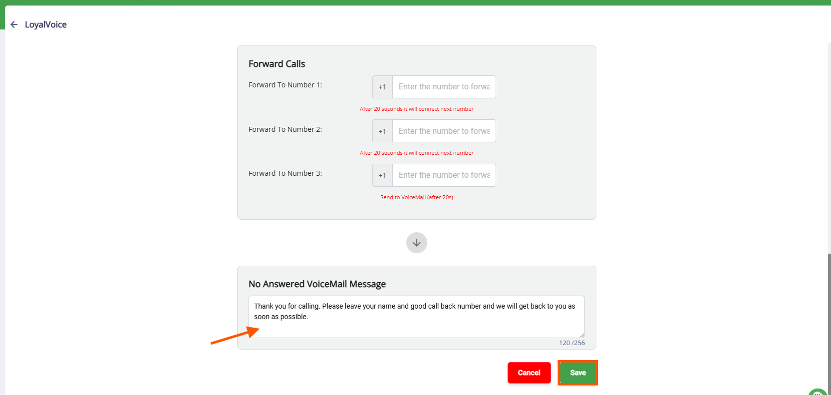 4. You can set a voicemail message to play if no one answers. Click Save to save your changes to save your changes