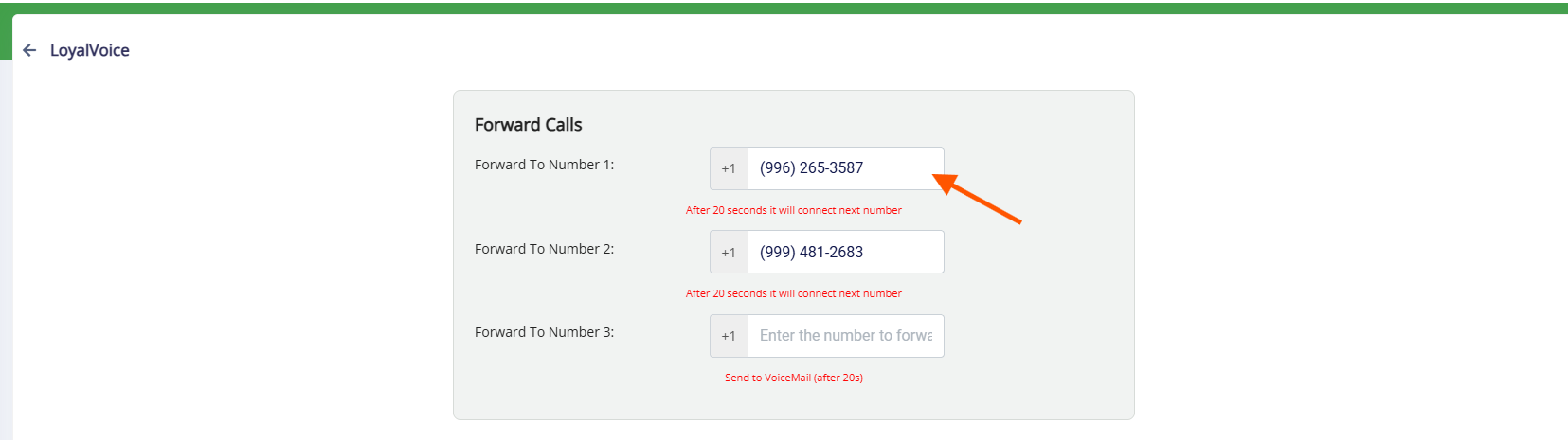 3. Add up to three forwarding phone numbers. Arrange them based on the orders you want them called
