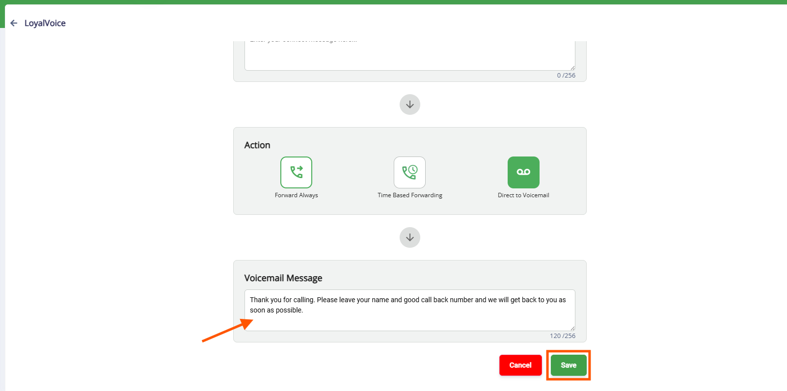 2. Enter your voicemail message. Click Save once completed