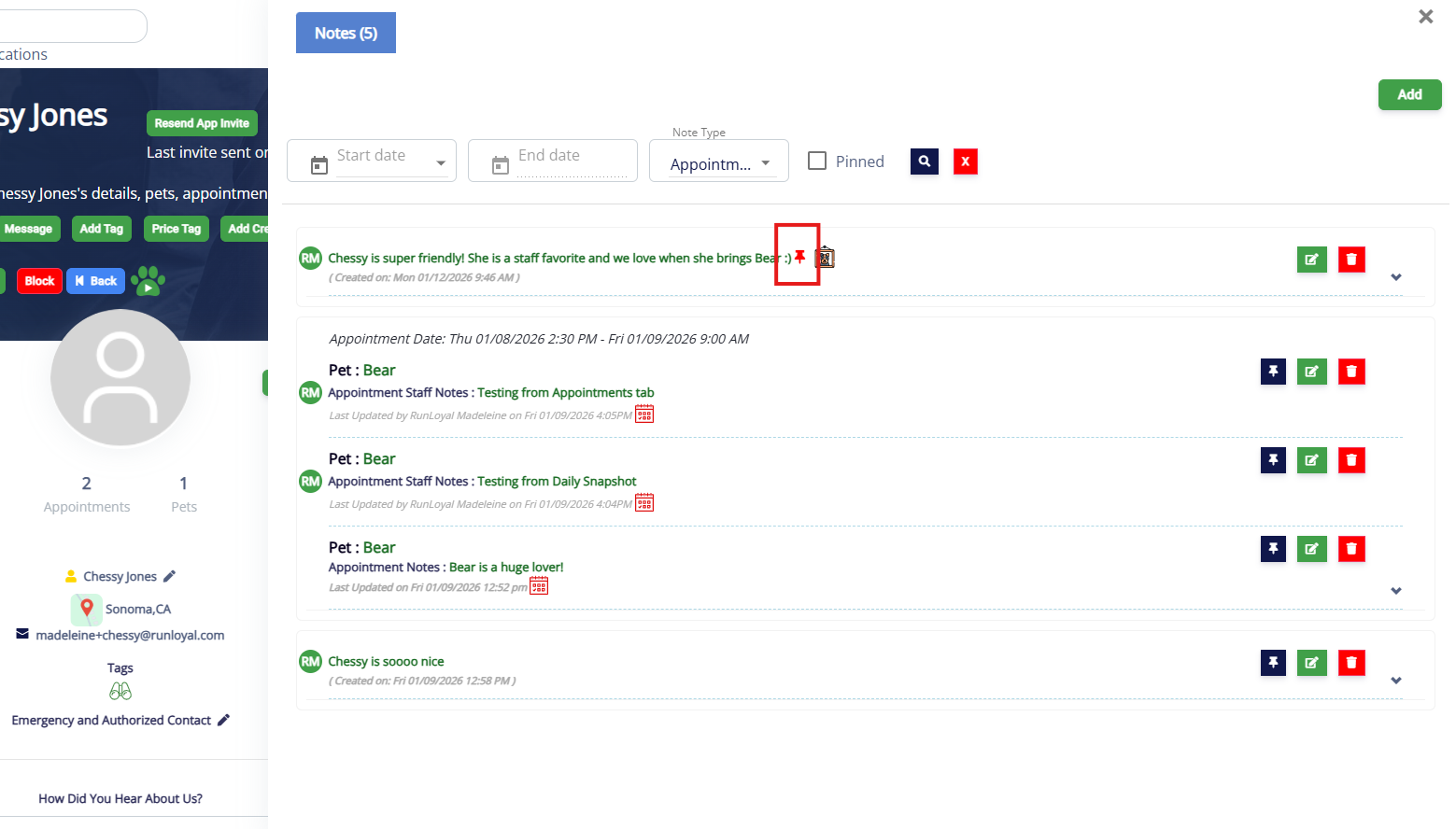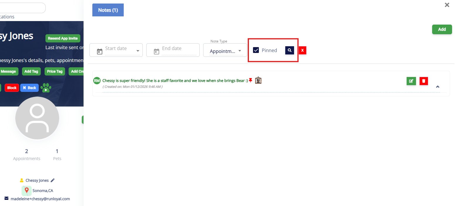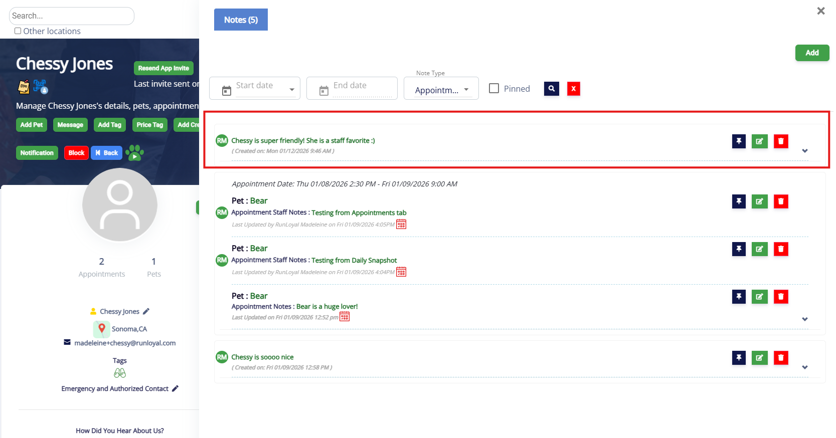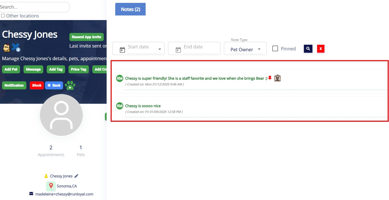 Pet Owner Staff Notes are a great way for businesses to keep track of important information about a pet owner who brings their animal to your business. Notes are organized by updated date so you can easily see the most recent information. You can also pin a note if you want to ensure key information stays easy to find.