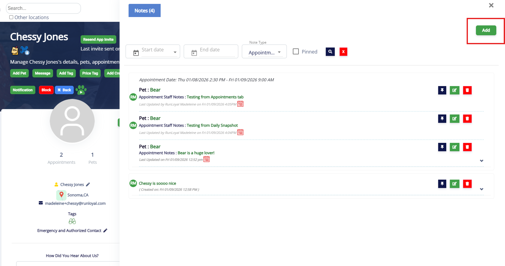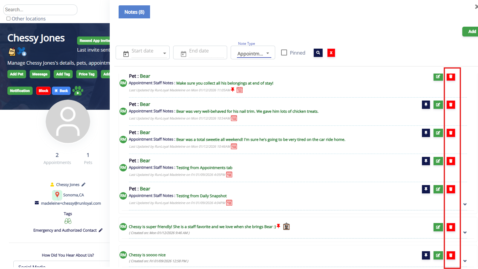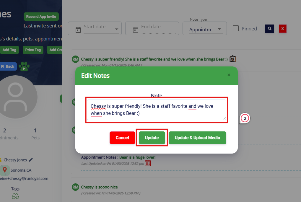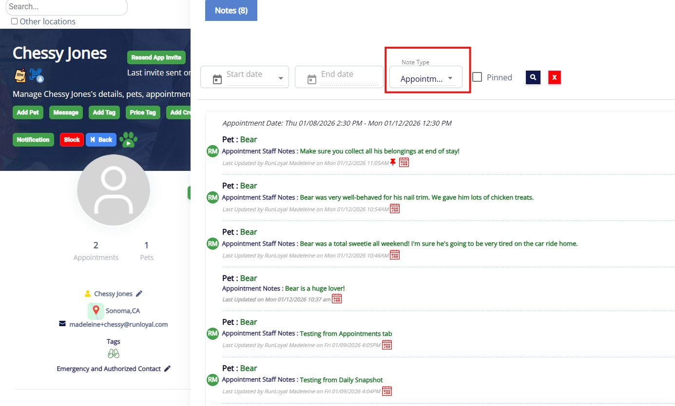 Pet Owner Staff Notes are a great way for businesses to keep track of important information about a pet owner who brings their animal to your business. Notes are organized by updated date so you can easily see the most recent information. You can also pin a note if you want to ensure key information stays easy to find.