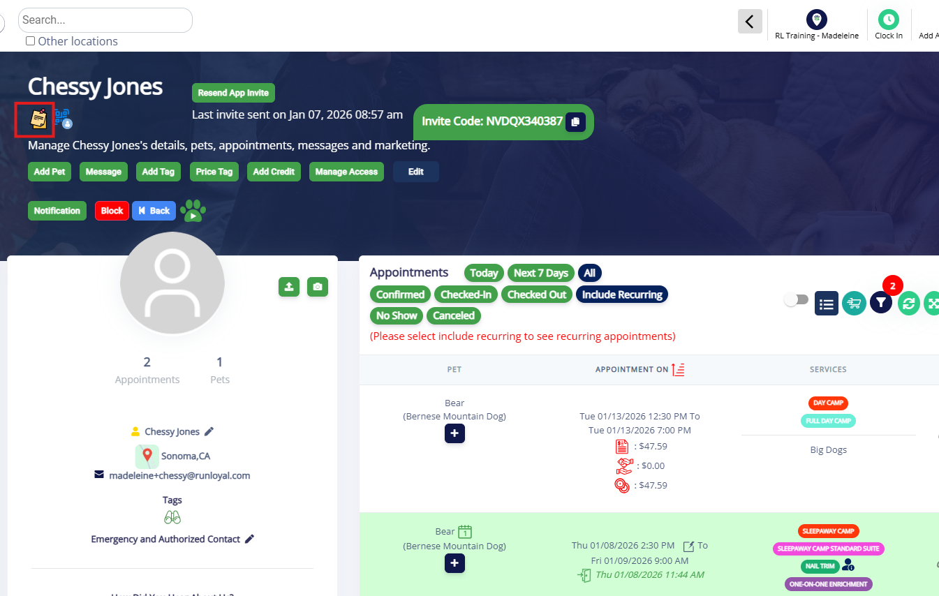 1. Navigate to any pet owner profile and click the Notes icon in the top left of the page, just under the client's name.