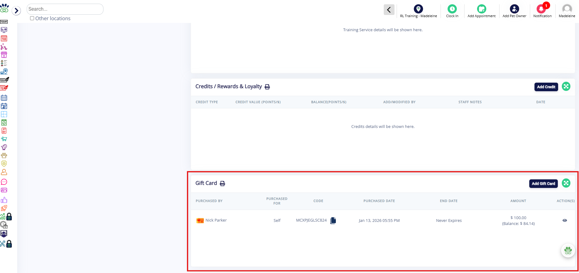 For more information on viewing gift cards on a pet owner profile, please refer to this article: How to Locate an eGift Card Code on a Pet Owner Profile