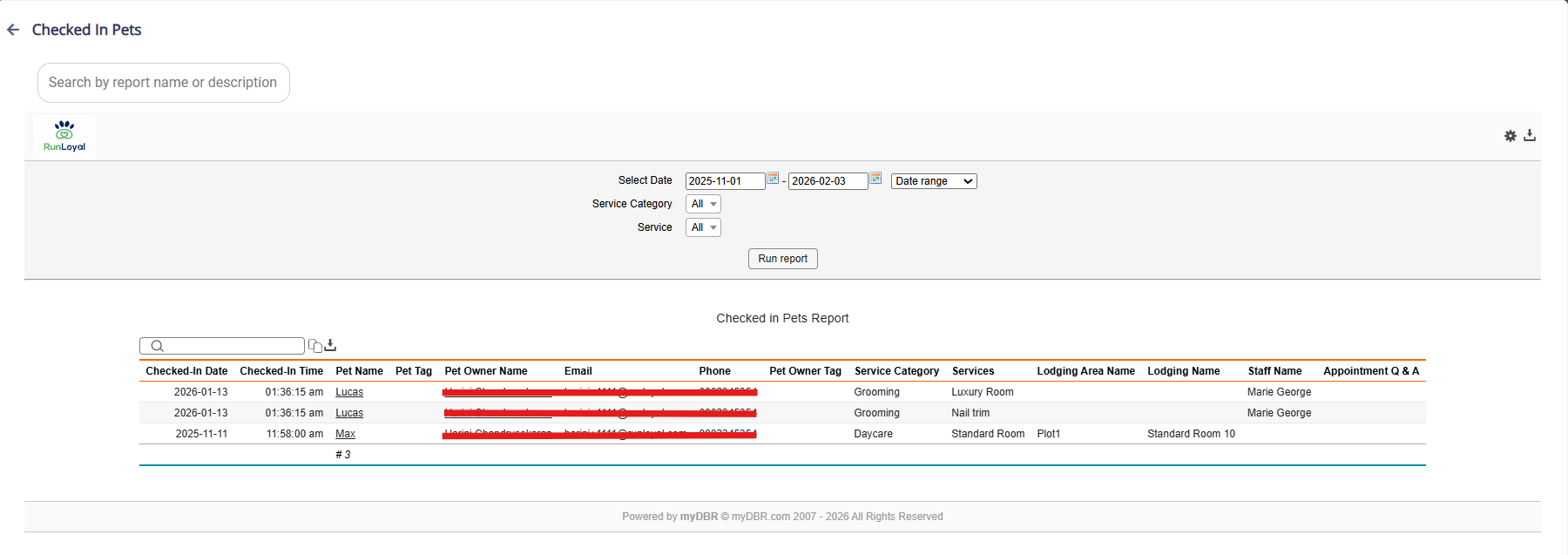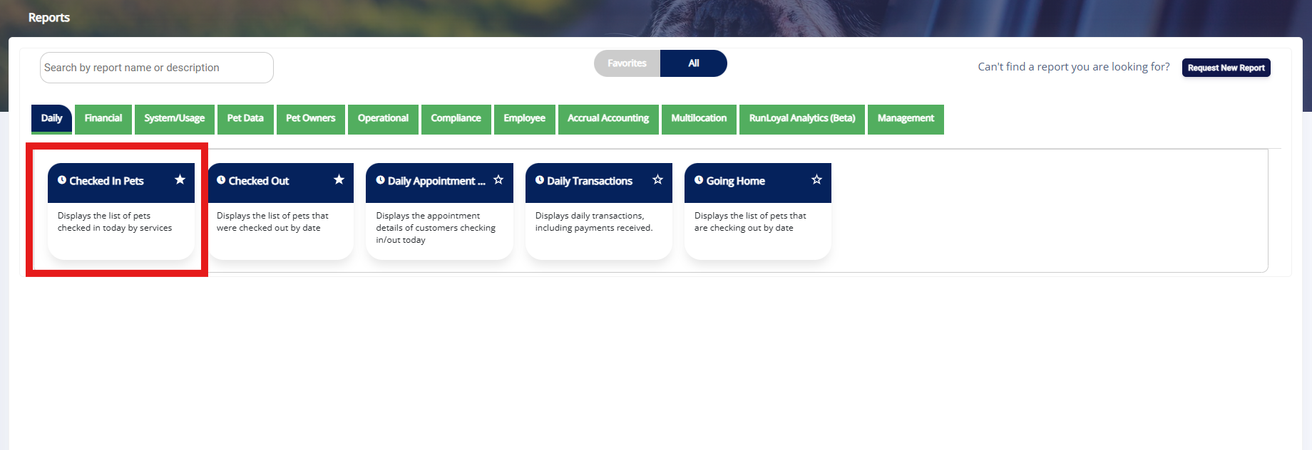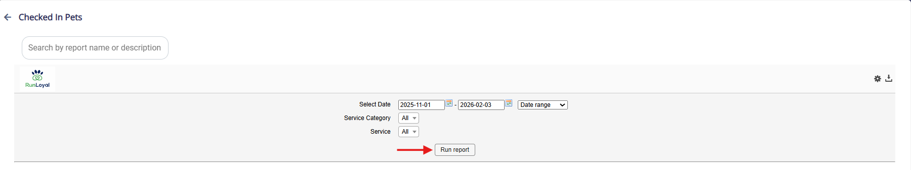 To run a report, navigate to the report you want to generate. For example, the Checked-in Pets Report.